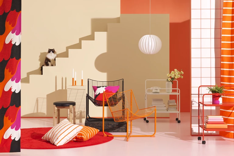 W skład kolekcji wchodzą na przykład poszewki na poduszki NICKFIBBLA, które dodają przestrzeni kolorów, poszewki SVEDJENÄVA, przypominające odciski zwierzęcych łap, i okrągły dywan STOENSE w wyrazistej czerwieni, który pojawił się w katalogu IKEA już w 1959 roku. W kolekcji znalazły się również pomarańczowy świecznik TUVKORNELL, wykonany z resztek niewykorzystanej przy produkcji stali, a także lekki stolik na kółkach JÄRLÅSA, który pozwala na wygodne podawanie napojów lub przemieszczanie przedmiotów. Na uwagę zasługuje również fotel SKÅLBODA, inspirowany metalowym wózkiem na zakupy.