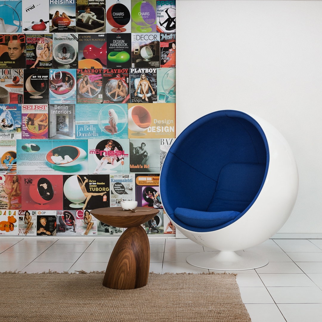 Mebel autorstwa Eero Aarnio z 1963 roku powstał jako eksperyment z formą i materiałem – projektant wykorzystał włókno szklane, by stworzyć niemal idealnie kulistą bryłę. Jak sam wspominał, punktem wyjścia była bardzo prosta potrzeba. Projektant wraz z rodziną wprowadzili się do nowego domu, ale brakowało im dużego, wygodnego fotela. To szybko przerodziło się w poszukiwanie nowej formy. „Zauważyłem, że kształt stał się tak prosty, że był po prostu kulą” – mówił Aarnio. Prototyp powstał ręcznie, przy użyciu formy i laminowanego włókna szklanego, a jego proporcje były testowane w skali 1:1.