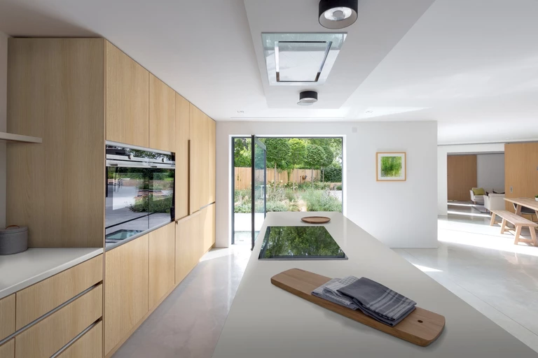 Kuchnia zaprojektowana przez firmę Korner dla Pfleiderer. W aranżacji zastosowano dekory z nastroju Nordic – Marmur Calacatta S63054, Jesion Portland Ciemny R34024, Granat Królewski U17500 oraz Salsa U16166