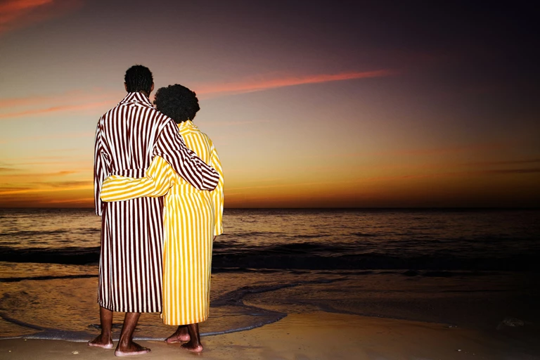 Wizytówkę Palm Heights stanowią bogate wzory i jaskrawożółty kolor – taki jak na parasolach kurortu, ustawionych wzdłuż plaży. Teraz zdobią one kolekcję i szyte na miarę opakowania produktów. Centralnym elementem serii są bawełniane ręczniki plażowe i szlafroki w żółto-białe lub ziemisto-brązowo-białe paski z kraciastymi wykończeniami.