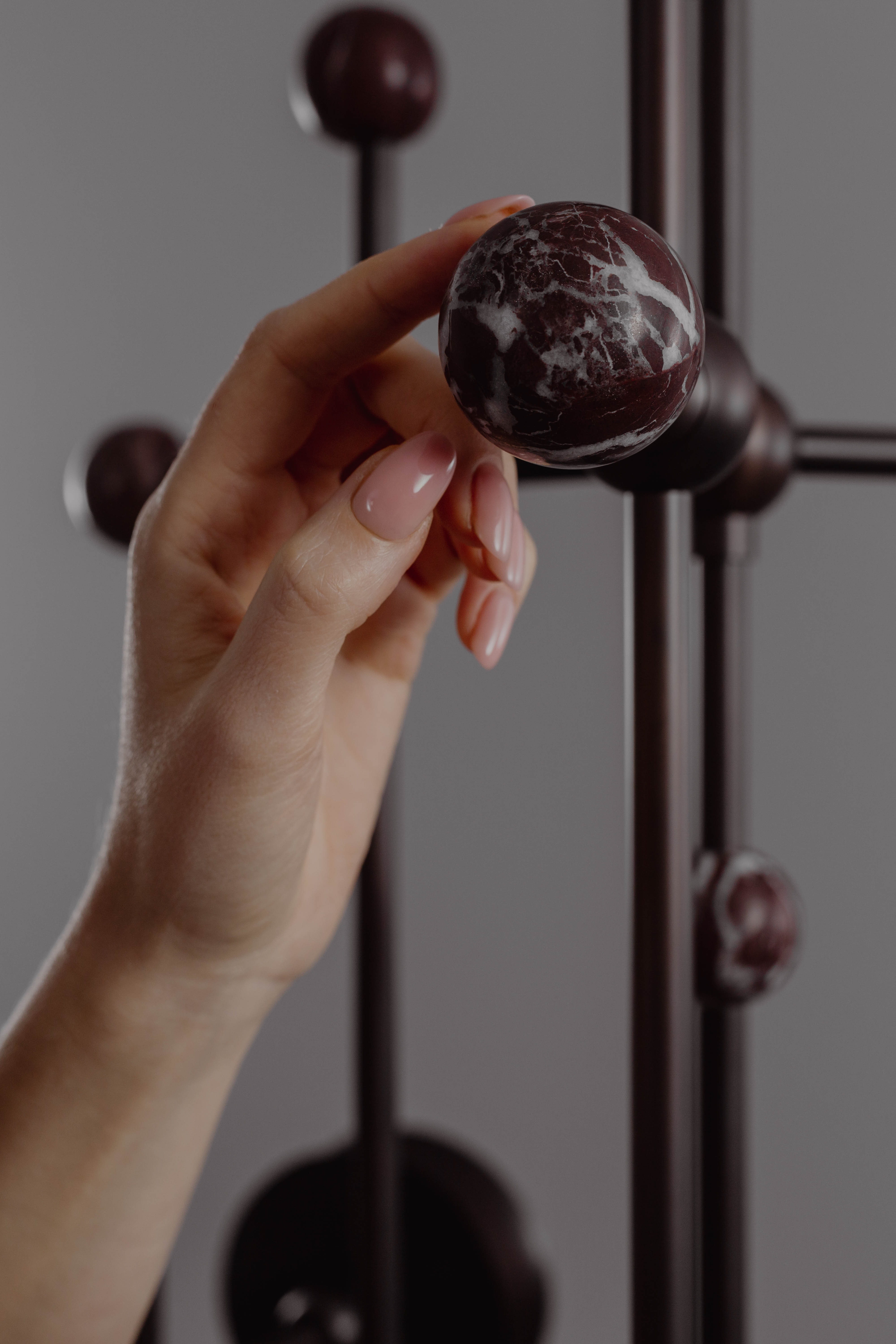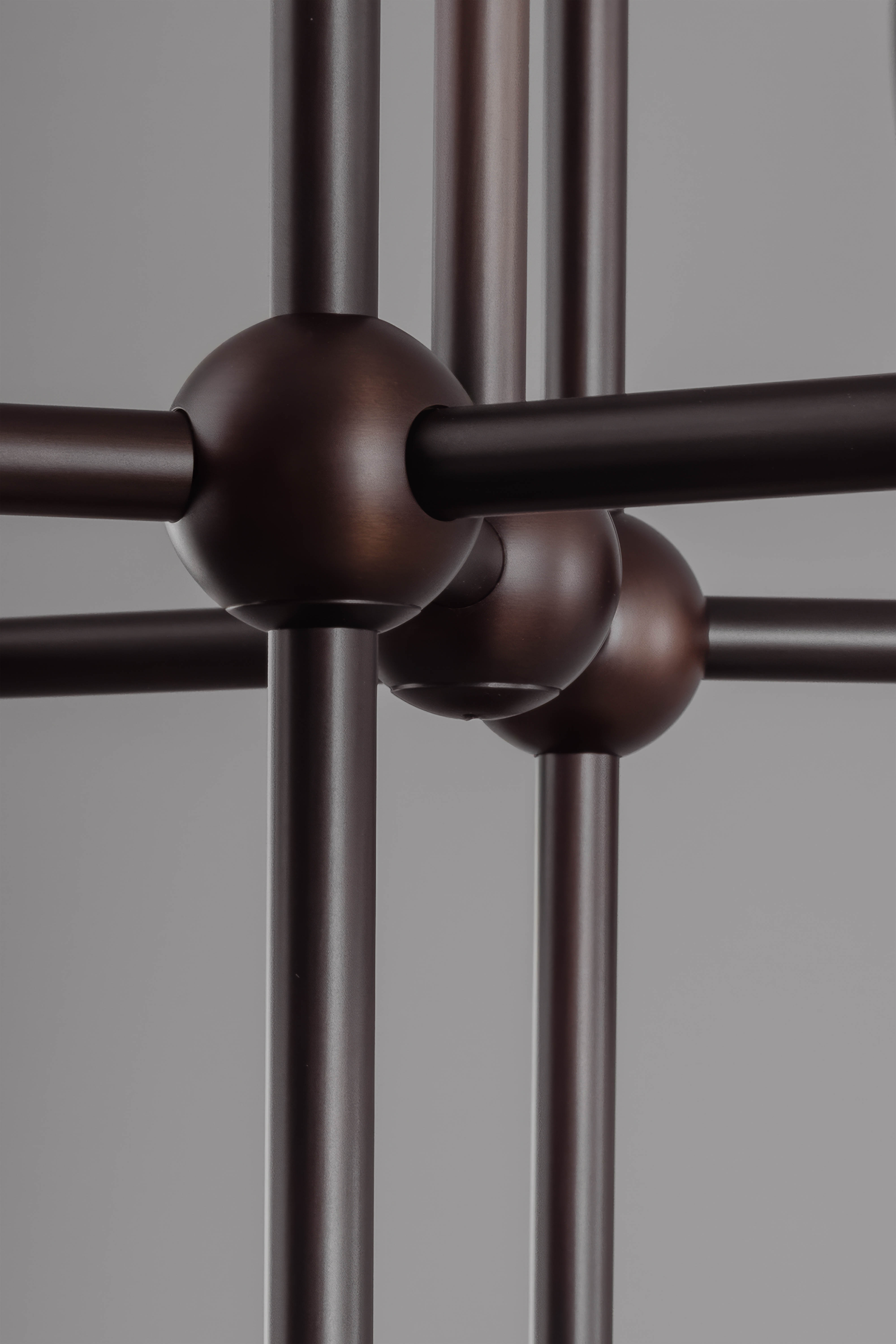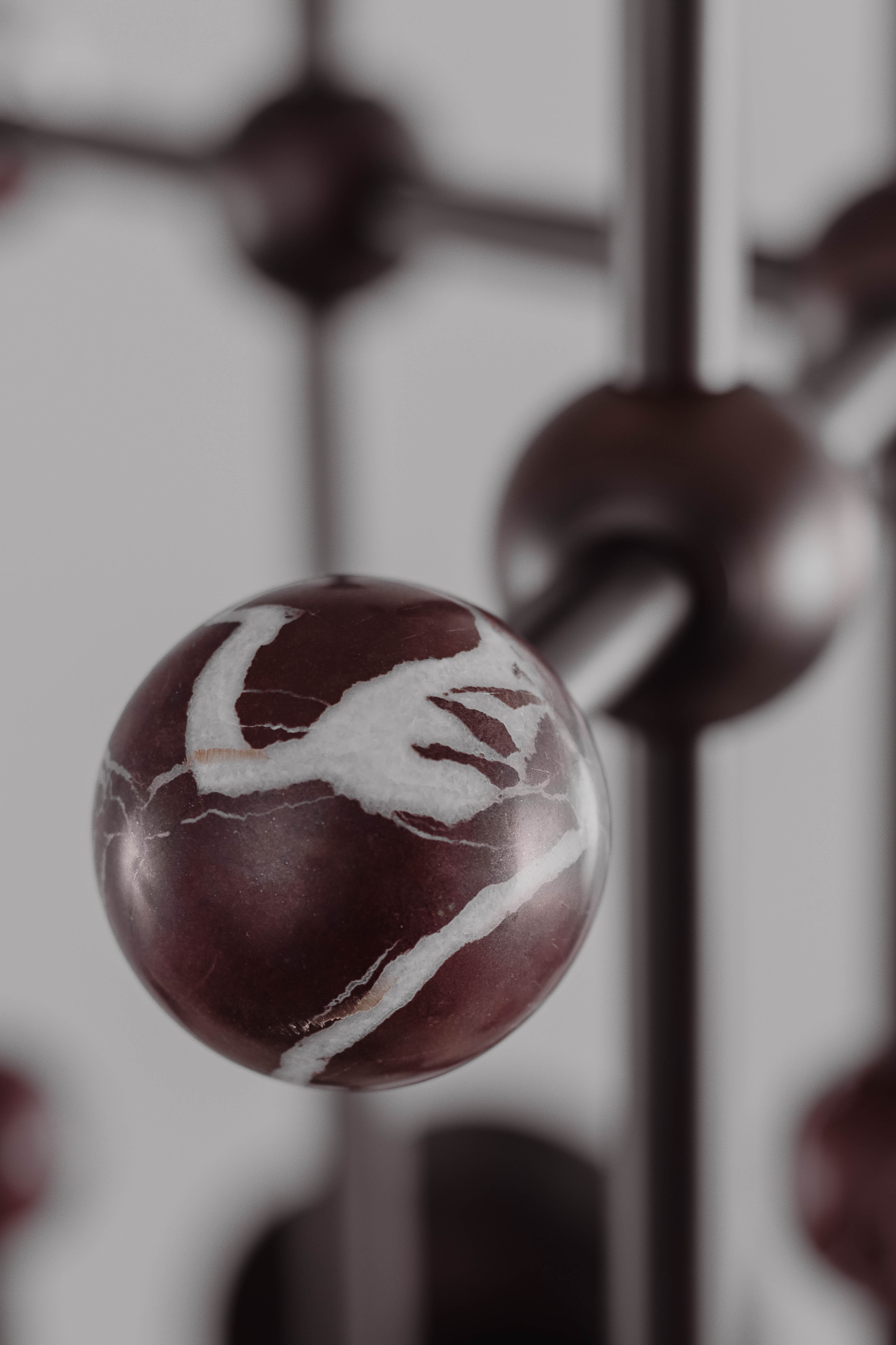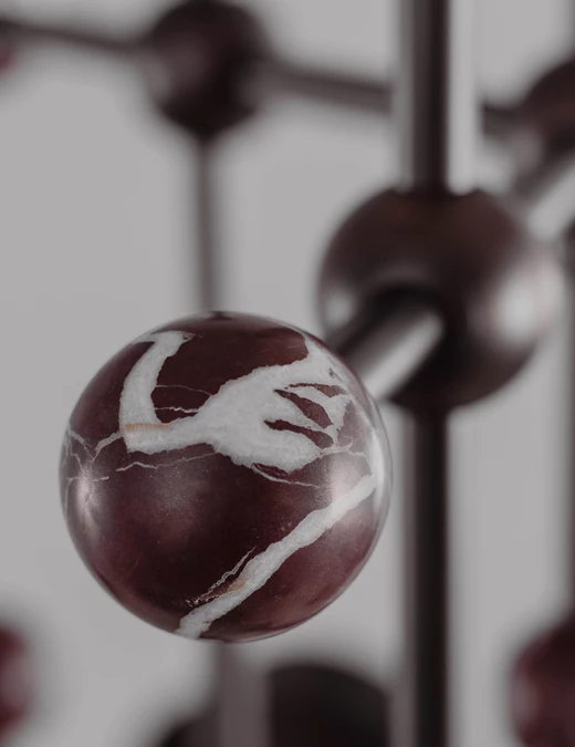 Żyrandol Babylon rozwija ideę dawnego miasta jako punktu pomiędzy niebem a ziemią - osi, wokół której wszystko się porządkuje. Mosiężny trzon staje się centrum, z którego w precyzyjnym układzie rozchodzą się marmurowe kule, niczym konstelacja inspirowana rytmem znaków klinowych. Światło podąża po ramionach kompozycji, prowadząc wzrok dalej, poza to, co natychmiast widoczne.