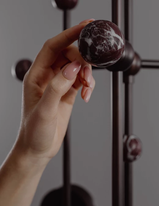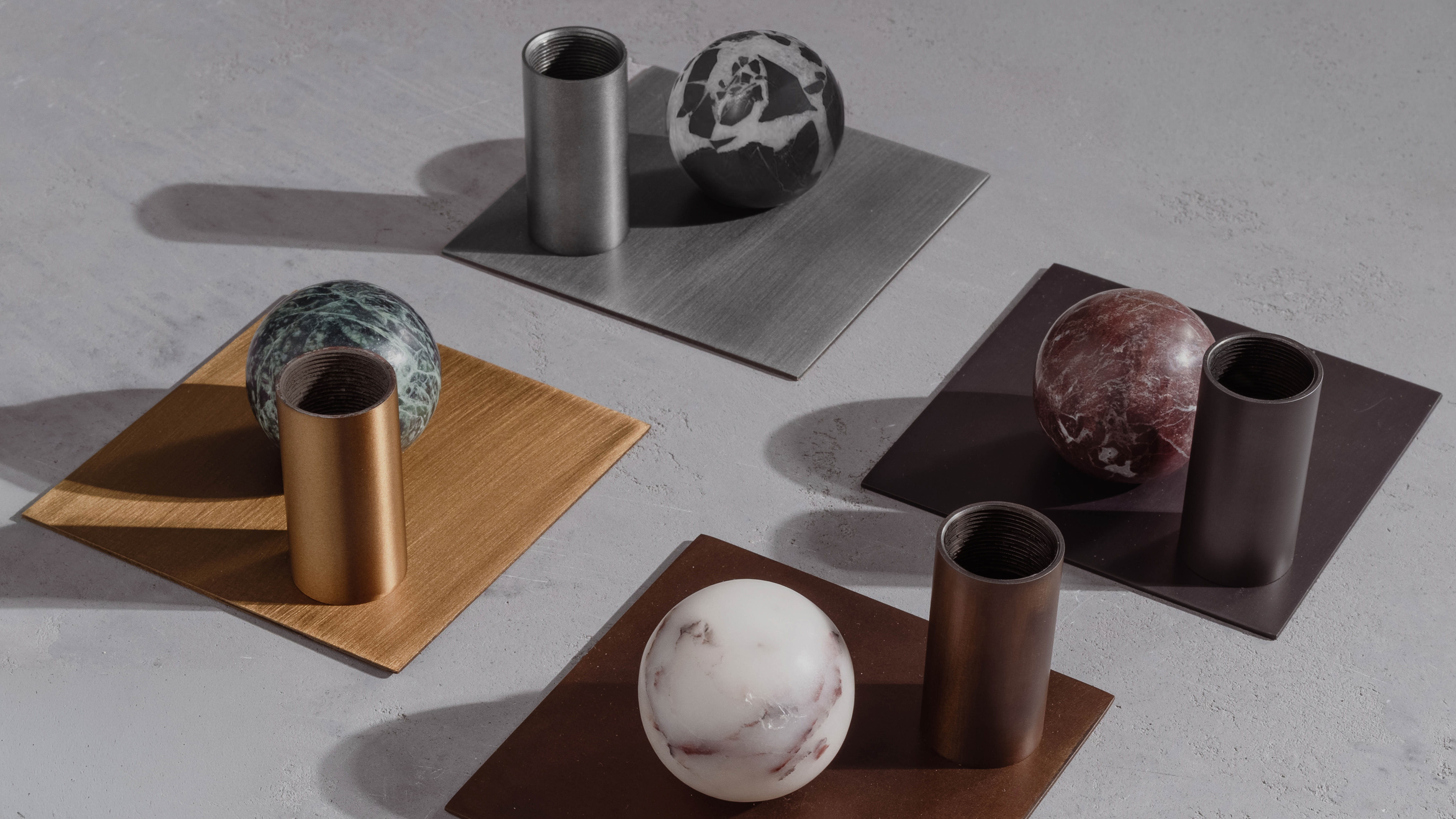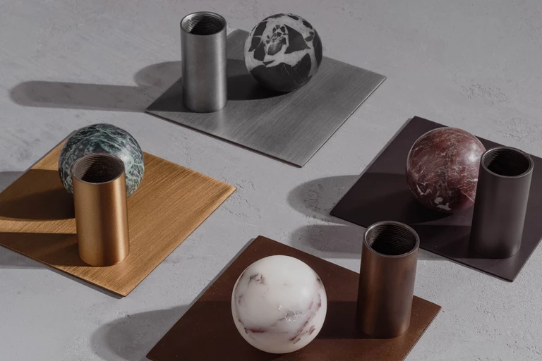Rzemiosło opiera się na dialogu mosiądzu i marmuru, zestawionych w czterech starannie dobranych konfiguracjach: Vintage Brass z Verde Alpi, Mahogany z Calacatta Viola, Classic Bronze z Rosso Levanto i Tarnished Silver z Calacatta Black. Każda z nich tworzy zamkniętą, wyważoną całość, a w projektach indywidualnych może być dalej komponowana w niemal nieograniczonych relacjach.