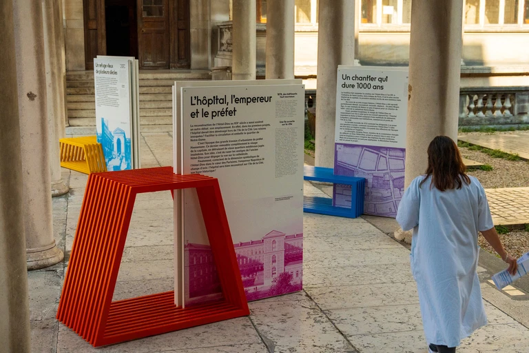 To właśnie bogata historia miejsca i jego położenie stały się inspiracją do stworzenia wystawy – mediacji, która jest zaproszeniem do wejścia w interakcje z przestrzenią, przeszłością i funkcją Hôtel-Dieu. Zgodnie z wizją Cyrila Delhomme, Studio Boloz stworzyło nowoczesne, kolorowe, modułowe elementy, które kontrastują z monumentalną architekturą budynku, przyciągając uwagę przechodniów.