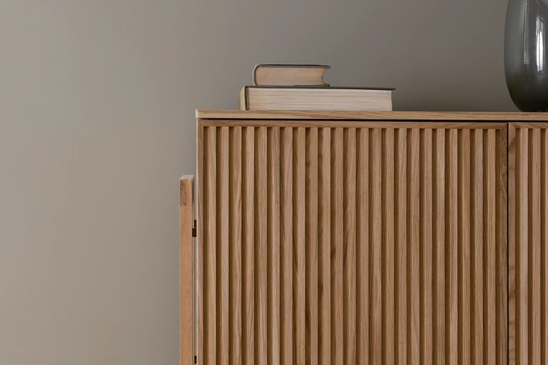 Komoda Phab w projektowym założeniu ma za zadanie oddać połączenie prostoty formy, użytecznej funkcji, na równi z wydobyciem ciepła i trwałości naturalnego materiału, do czego służy rytmiczny detal frontów komody. Rytm drewna w swojej kontrastowej strukturze przyciąga spojrzenie i kieruje je na piękny surowiec — naturalny dąb. Rytmiczny akcent zdobiący powierzchne powstaje z cennych oflisów pozostałych przy produkcji stołów.