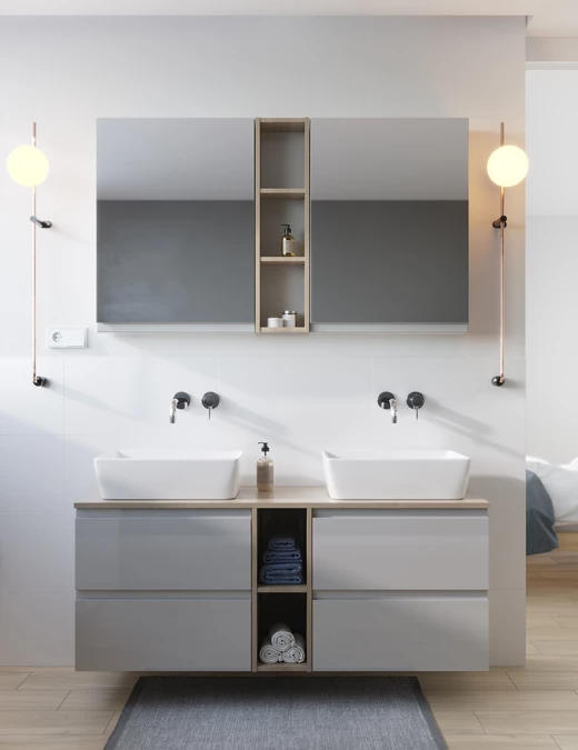Jeżeli dysponujemy łazienką o dużym metrażu zdecydujmy się na kompozycję mebli składającą się z blatu, szafek podblatowych (60 lub 80 cm), dopasowanej umywalki nablatowej, słupka i wiszących szafek w różnych rozmiarach (40 lub 60 cm) połączonych modułem otwartym w kolorze dębu. Dzięki temu uzyskamy optymalną ilość miejsca do przechowywania, a decydując się na słupek z wewnętrznym lustrem sprawimy, że nasza łazienka doskonale sprawdzi się jako część garderoby. Szukając bardziej kompaktowych rozwiązań sięgnijmy po zestaw składający się np. z umywalki, szafki podumywalkowej, modułu otwartego lub szafki lustrzanej, który nie będzie wyglądać „przytłaczająco” nawet w małym wnętrzu.