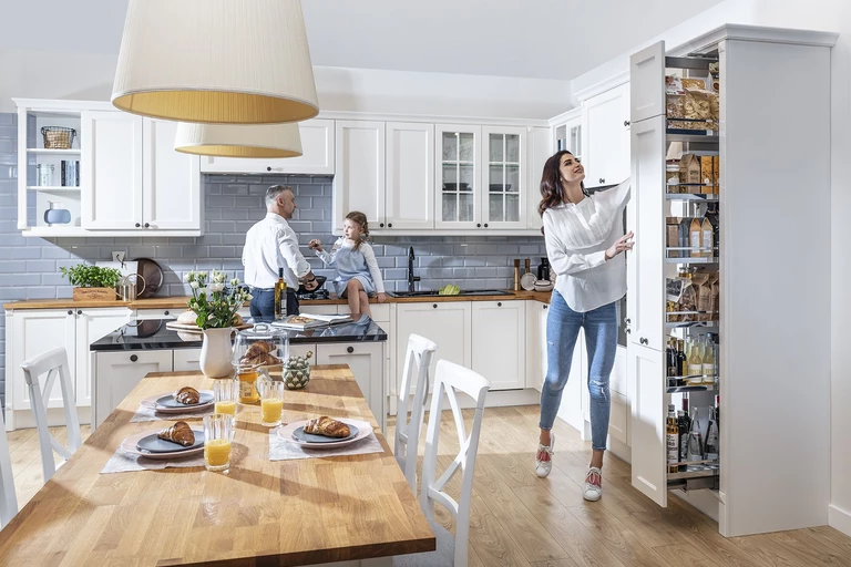 Dla komfortowego użytkowania kuchni, trzeba też przewidzieć wygodne wysuwy na garnki, urządzenia oraz różne akcesoria w dolnej części zabudowy. Na szczególną uwagę zasługują systemy Peka dedykowane do trudnych miejsc, takich jak narożniki zabudowy meblowej.