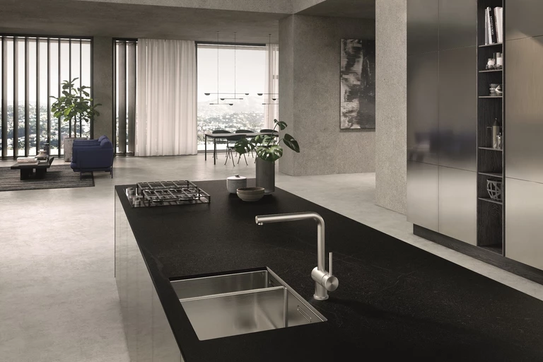 Dlatego idealnym wyborem do kuchni w stylu industrialnym jest czarna bateria. Tu dobry przykład stanowi model KLUDI BINGO STAR XS. Moc czerni została w niej złagodzona organicznymi akcentami oraz delikatnym łukiem wylewki. Wszystko to idzie w parze z wysoką funkcjonalnością m.in. dzięki wyciąganej wylewce i możliwości korzystania z dwóch rodzajów strumienia.
