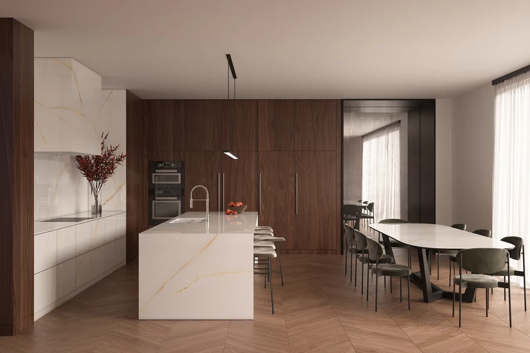 Cristallo Gold to ponadczasowy wzór naśladujący kwarcyt o niezwykle delikatnych beżowych, bursztynowych i złotych żyłkach na mlecznym tle. Spiek Laminam oddaje wyrafinowane piękno tej wyjątkowej skały, a co nie mniej ważne – jej urodę splata z doskonałymi parametrami technicznymi i użytkowymi, tak jak w naturalnym kwarcycie.