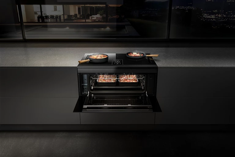 LHOV to jedno, zwarte w formie urządzenie, które zachowuje i podkreśla liniowy wygląd kuchni: bez wystających narożników, przerw czy widocznych łączeń. System pochłaniacza jest sprytnie ukryty w strefach ścian bocznych urządzenia, podczas gdy piekarnik znajduje się bezpośrednio pod płytą grzewczą na ergonomicznej wysokości, a wciąż pozostawia wolną przestrzeń poniżej na dodatkową szufladę.