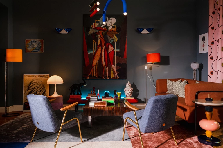 W drugiej części salonu znajduje się reprodukcja obrazu malarza Giorgio de Chirico. Czerwona sofa marki Hübsch wystawiona jest w towarzystwie kinkietów w stylu Space Age. Salon rozświetla kultowa lampa Panthella 320 proj. V. Pantona z 1971, a także kolorowe lampy z serii TRN od Pani Jurek. Błękitne fotele, proj. J. Chierowskiego, zostały wyprodukowane specjalnie na potrzeby aranżacji przez markę 366 Concept. Stolik Shuffle MH1 od &Tradition wspaniale komponuje się we wnętrzu z geometrycznym dywanem od szweckiej marki Layered.