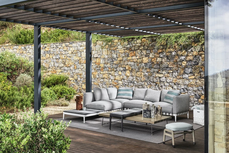 Flexform proponuje cały system sof, siedzisk, foteli i leżaków, które można z łatwością dopasować do rozmaitych potrzeb. Towarzyszą im stoły i zestawy stolików kawowych. Za ich pomocą można tworzyć w przestrzeni ogrodu rozmaite gościnne wysepki. Jedną przy basenie, drugą w cieniu starej lipy, trzecią na tarasie lub pod pergolą.