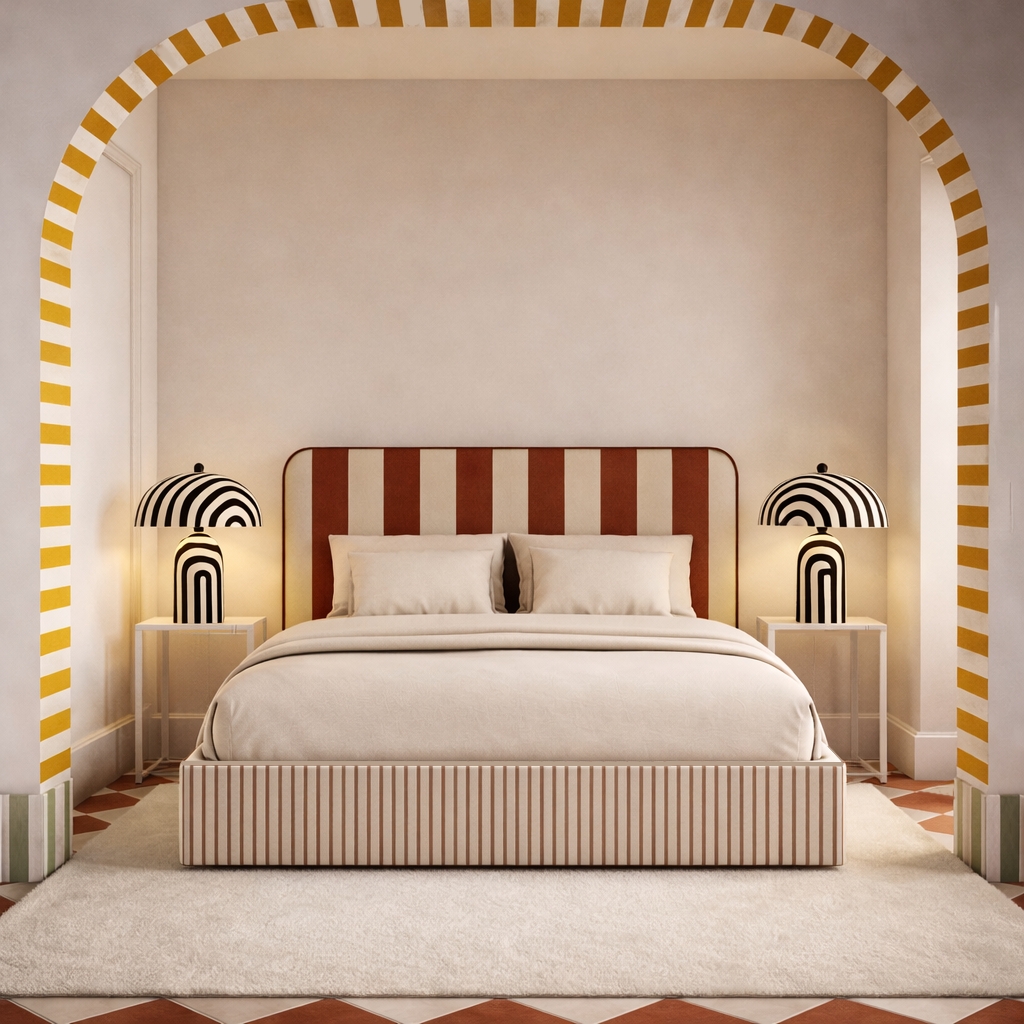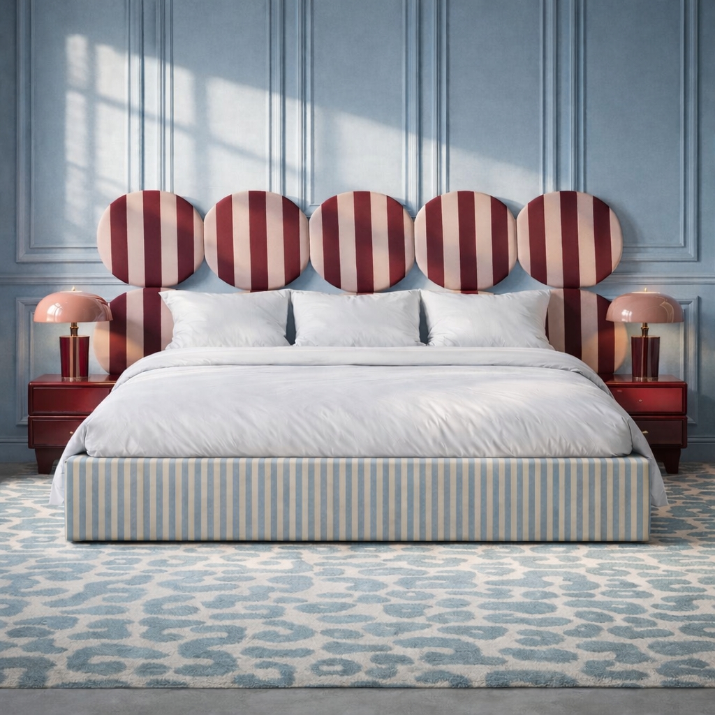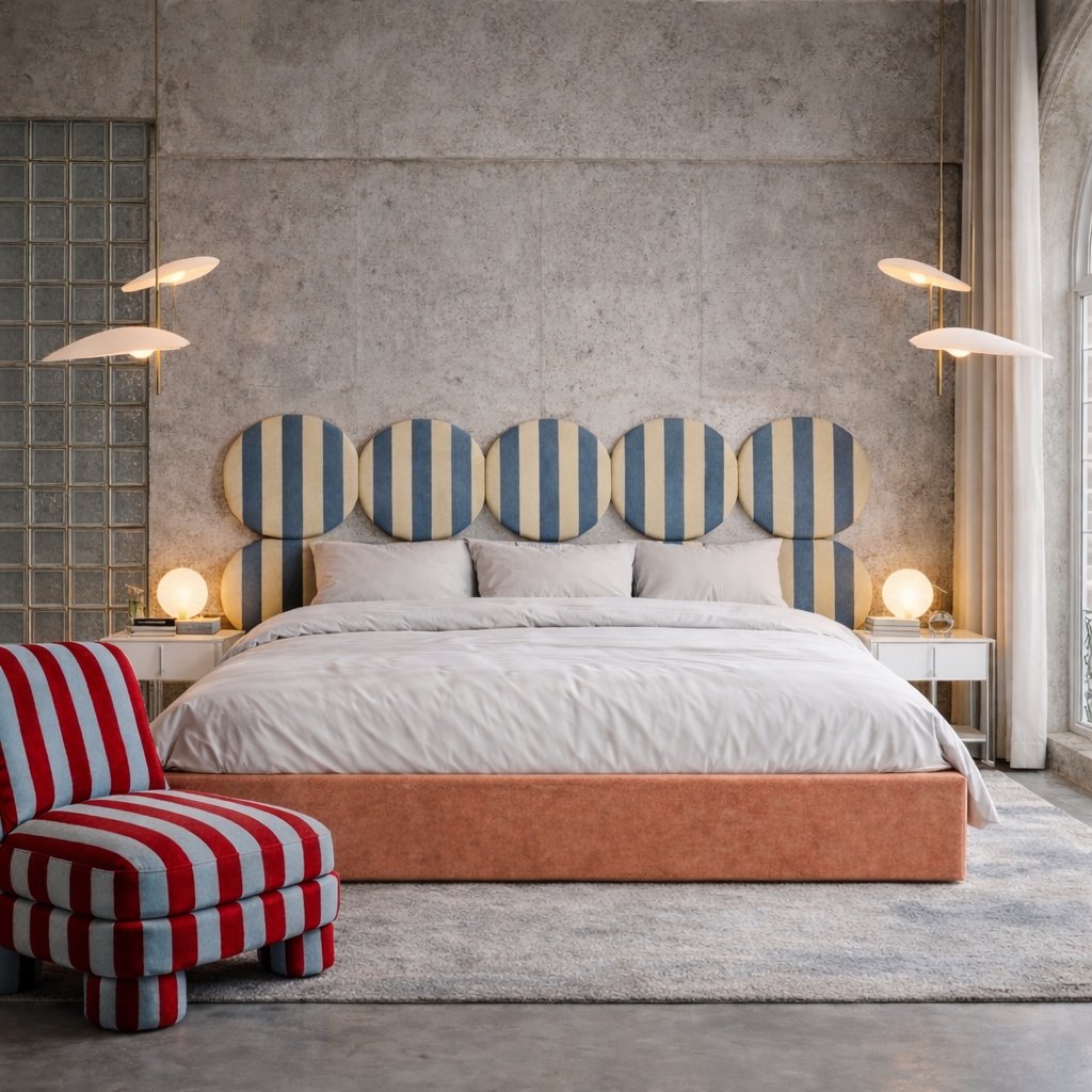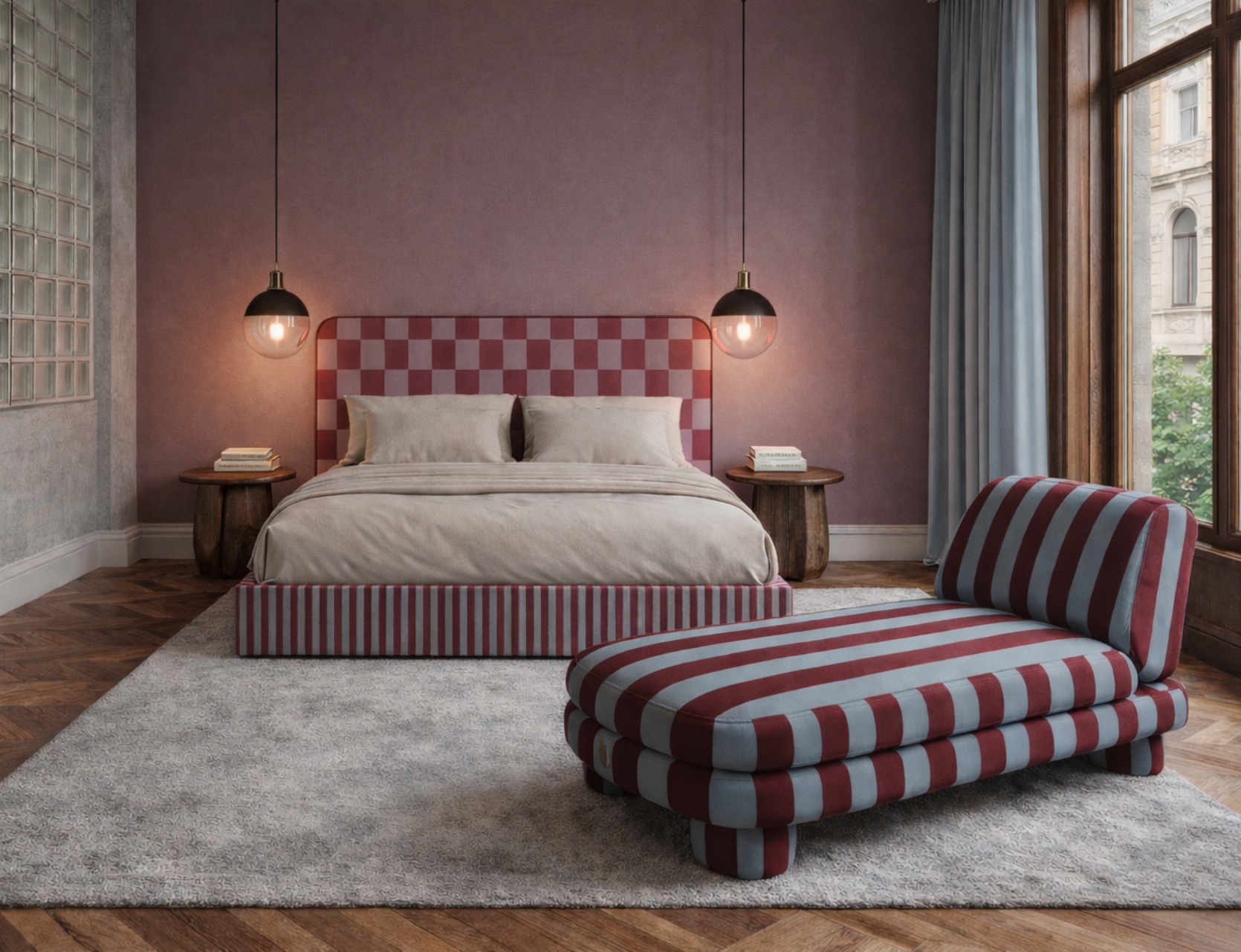 Najmocniejszym akcentem są zagłówki – rytmiczne, modułowe, niemal architektoniczne w formie. Ich powtarzalność i geometryczna dyscyplina przywołują skojarzenia z modernizmem, podczas gdy odważne zestawienia kolorystyczne wprowadzają postmodernistyczną lekkość i swobodę. To balans między kontrolą a ekspresją.