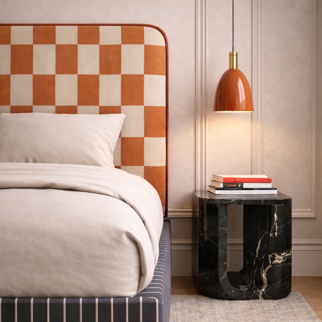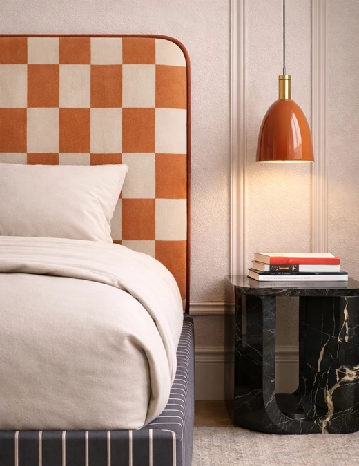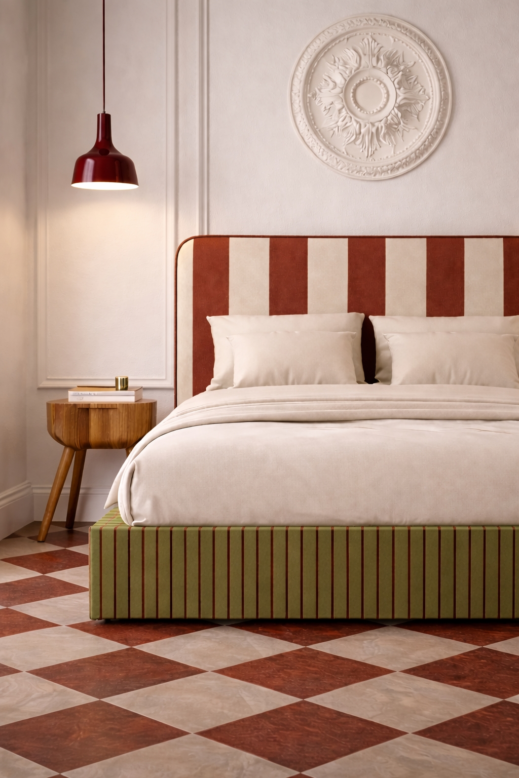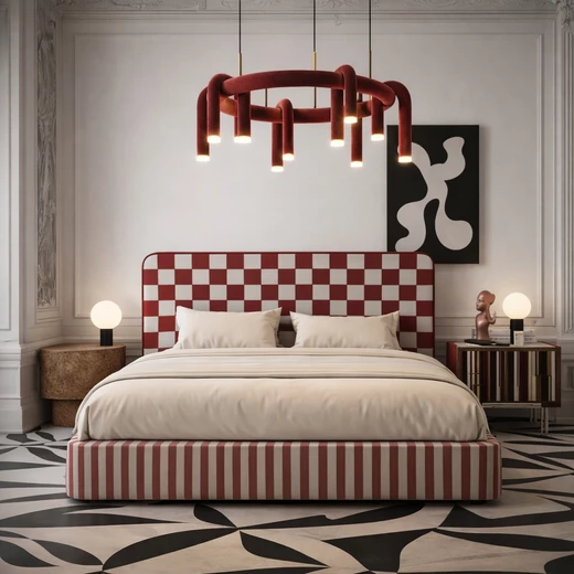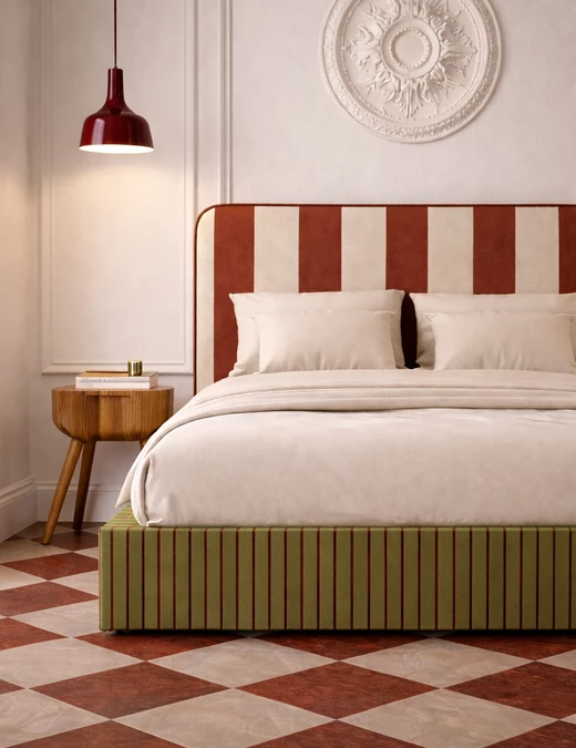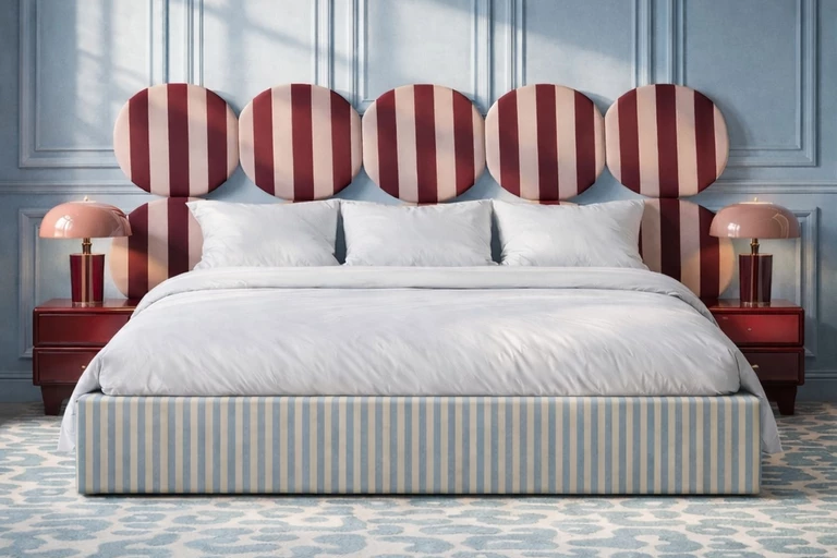 Najmocniejszym akcentem są zagłówki – rytmiczne, modułowe, niemal architektoniczne w formie. Ich powtarzalność i geometryczna dyscyplina przywołują skojarzenia z modernizmem, podczas gdy odważne zestawienia kolorystyczne wprowadzają postmodernistyczną lekkość i swobodę. To balans między kontrolą a ekspresją.