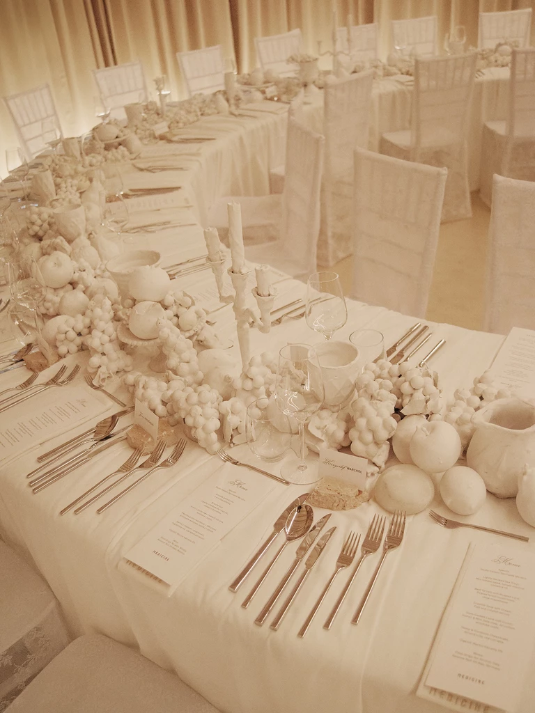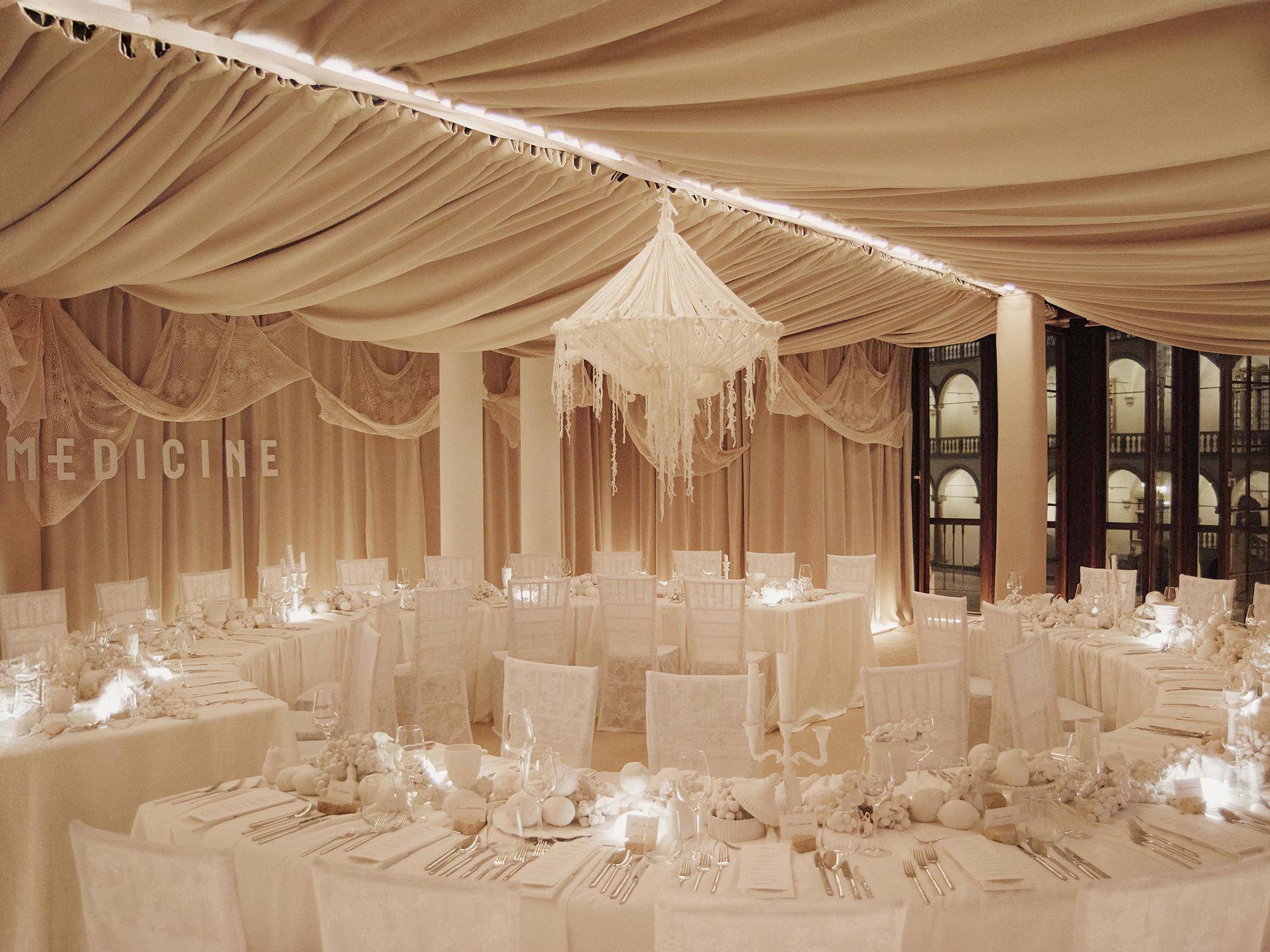 Beż, kolor kamienia i piaskowca, wyznaczyły tonację wieczoru. W sali Sigmunda przestrzeń przysłonięto tkaninami, pozostawiając jedno celowe otwarcie – okno z widokiem na arkadowy dziedziniec. Jak kadr czy pocztówka przypominało o źródle inspiracji. Wszystko inne – miękkie, przefiltrowane, dyskretne – zdawało się zanurzone w świetle wapiennego pyłu.