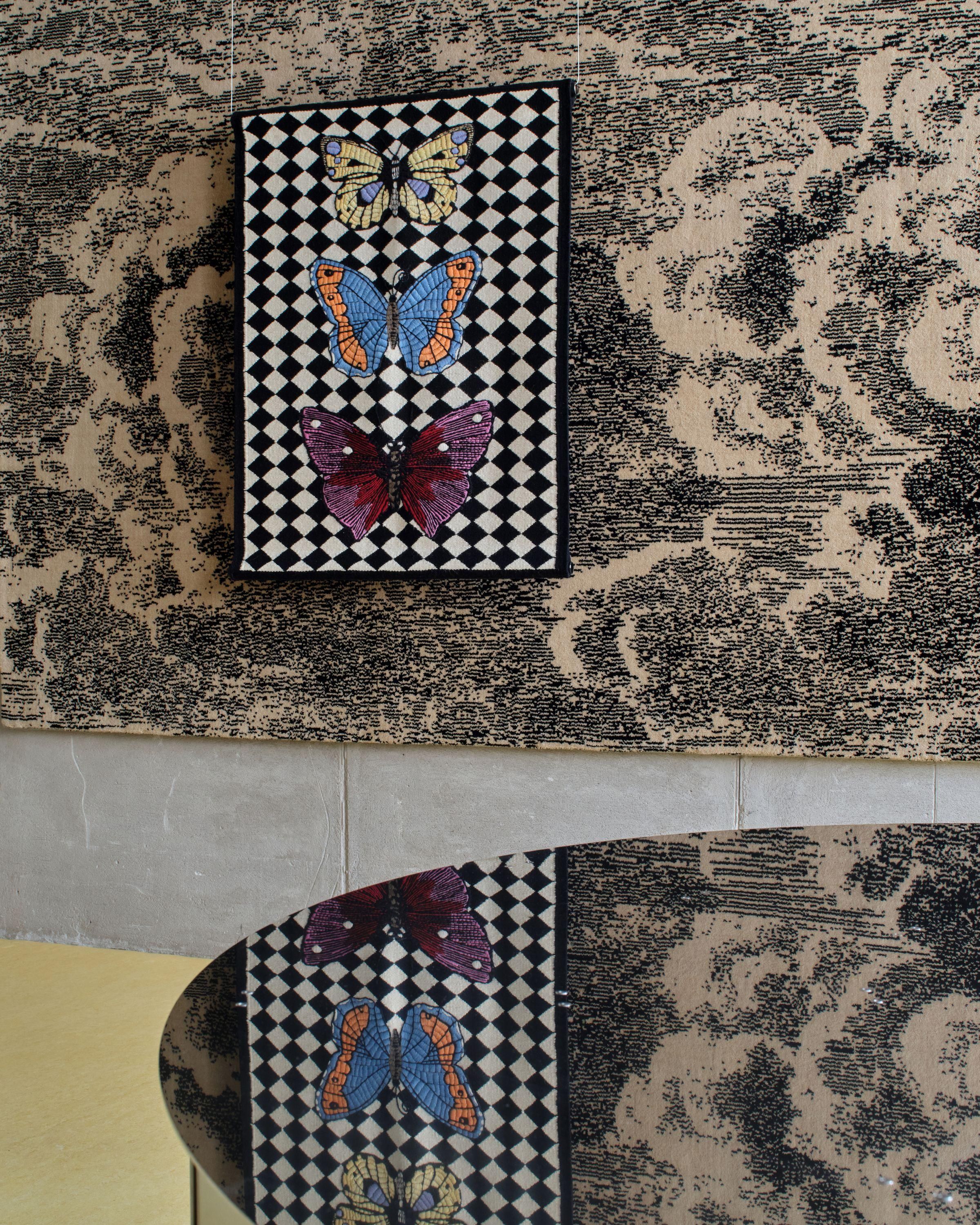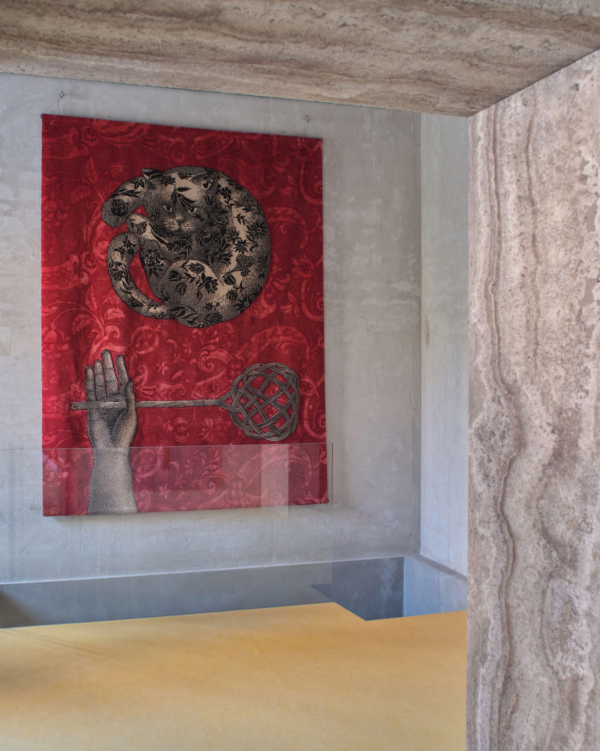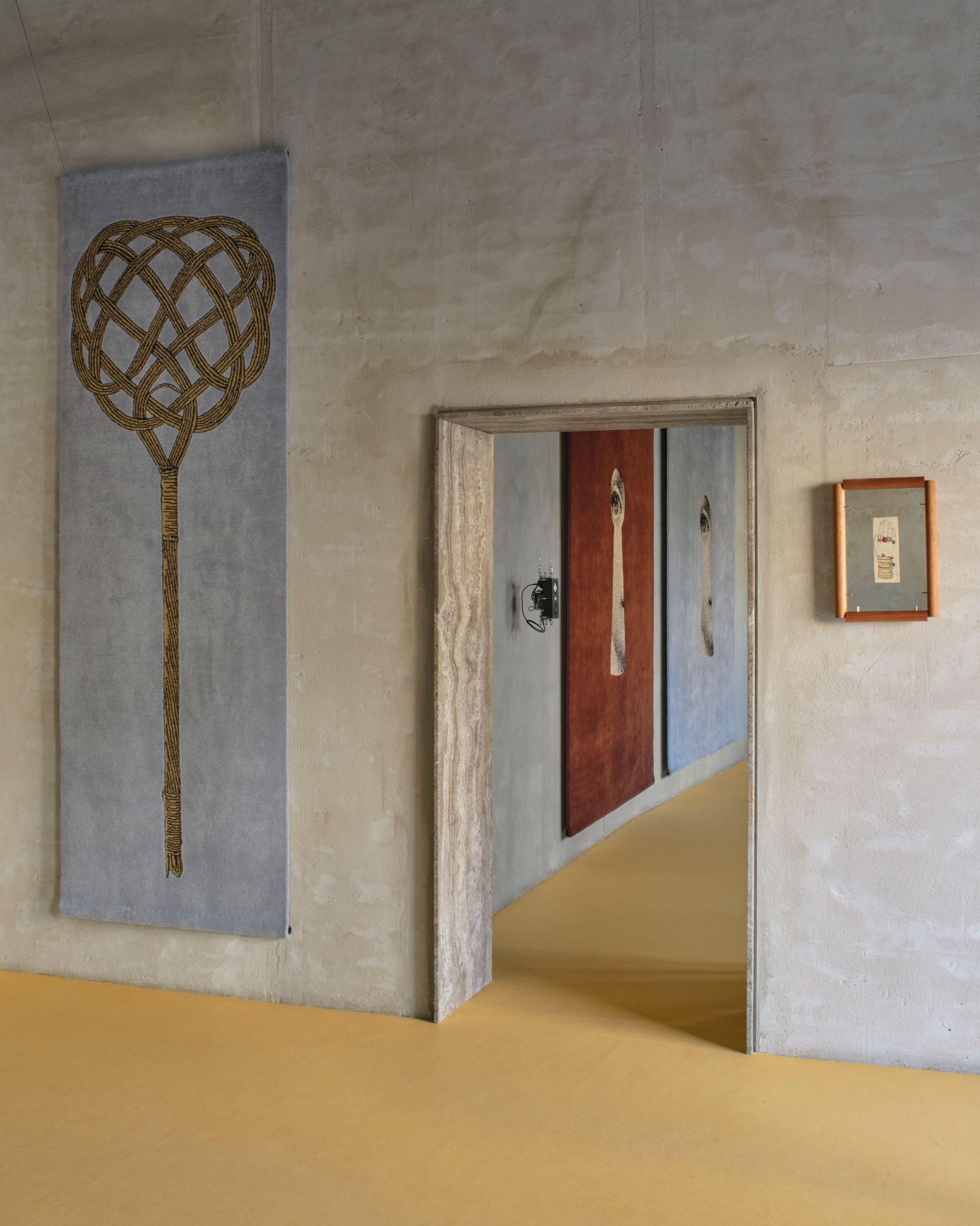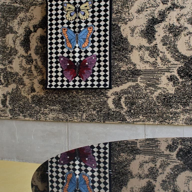 Tradycyjne motywy Fornasettiego, pełne iluzji, ironii i gry z perspektywą, zyskały tu nową, haptyczną głębię. To wielowymiarowe kompozycje, w których jedwab, wełna himalajska i merynos budują napięcie między światłem a cieniem. W skład kolekcji wchodzą zarówno monumentalne dywany wiązane tybetańskim węzłem, jak i kameralne gobeliny haftowane ręcznie przez rzemieślników z Uttar Pradesh.