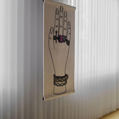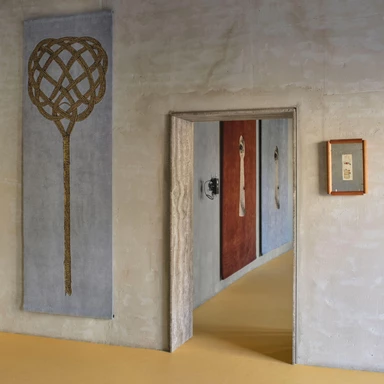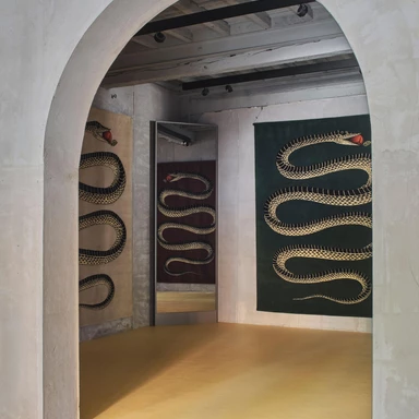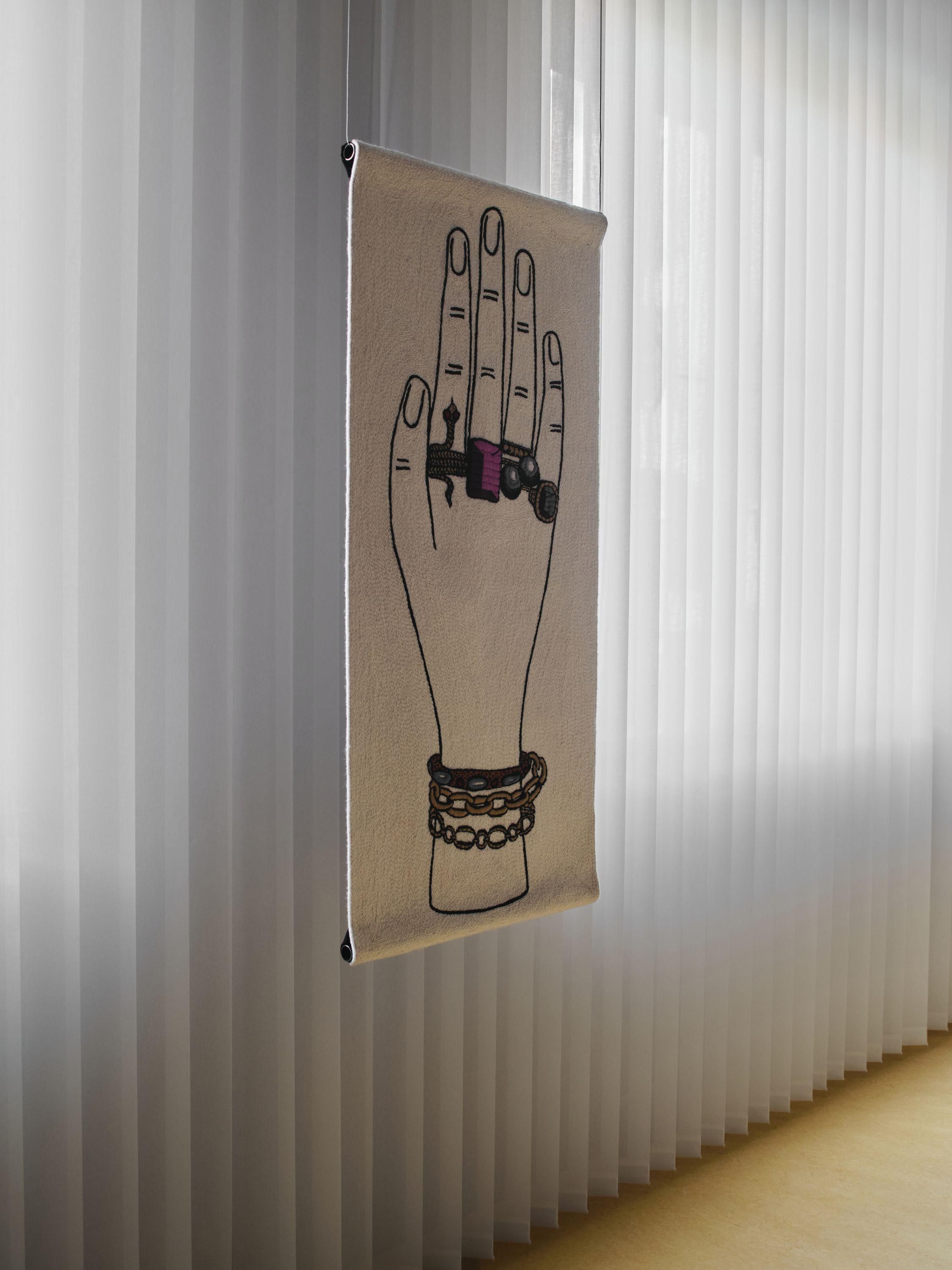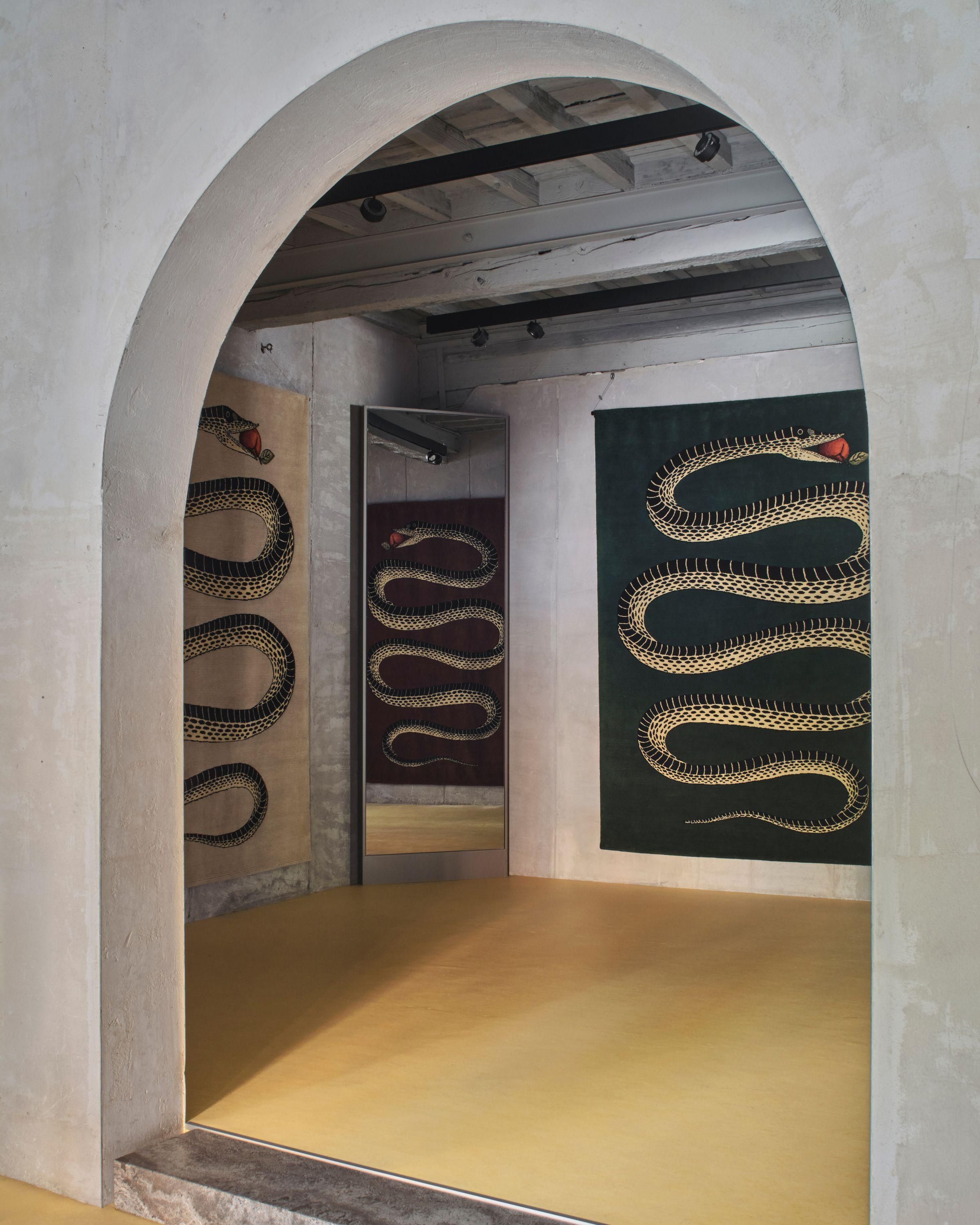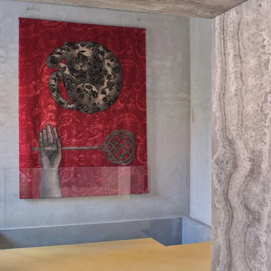 Tradycyjne motywy Fornasettiego, pełne iluzji, ironii i gry z perspektywą, zyskały tu nową, haptyczną głębię. To wielowymiarowe kompozycje, w których jedwab, wełna himalajska i merynos budują napięcie między światłem a cieniem. W skład kolekcji wchodzą zarówno monumentalne dywany wiązane tybetańskim węzłem, jak i kameralne gobeliny haftowane ręcznie przez rzemieślników z Uttar Pradesh.