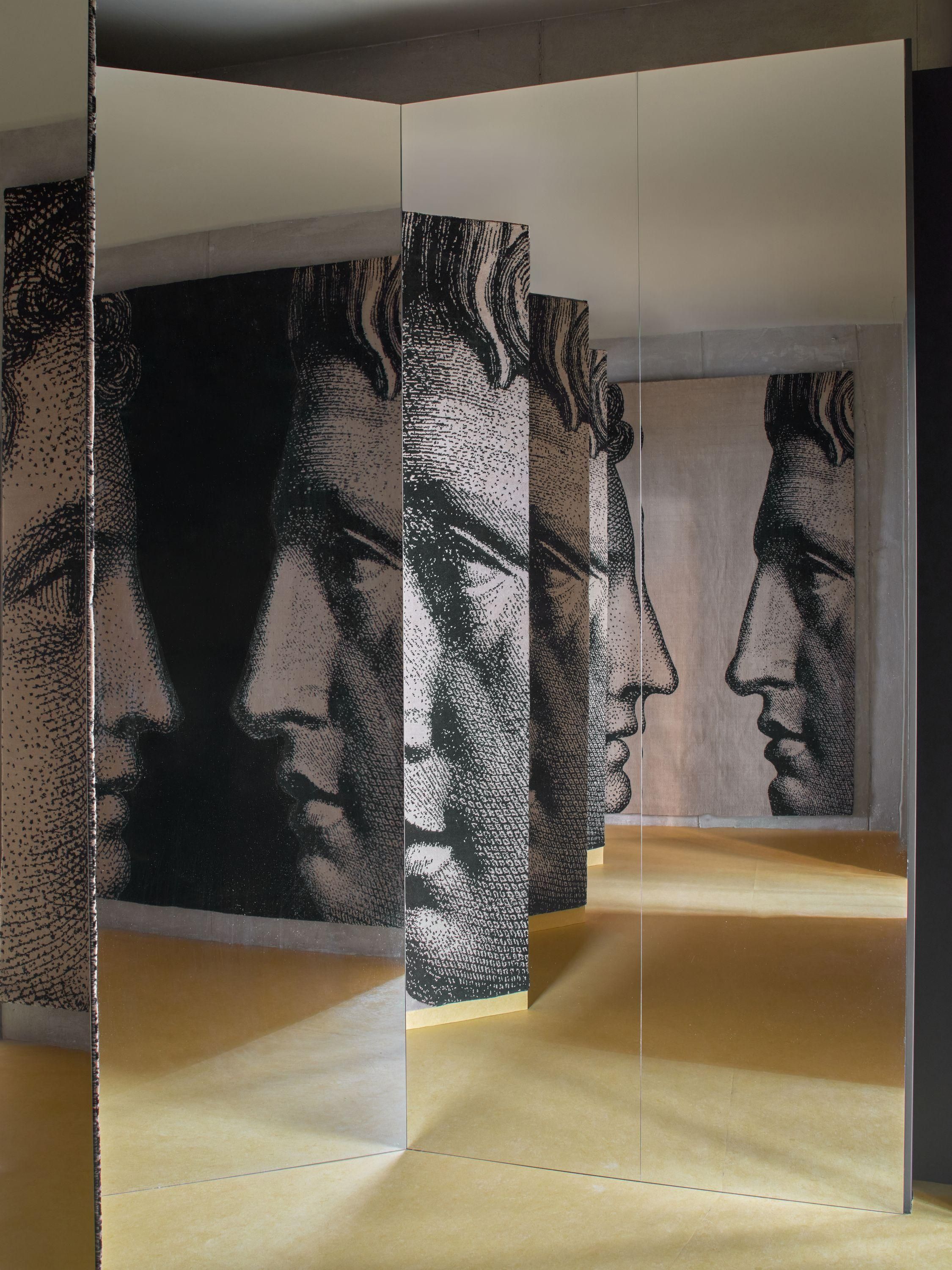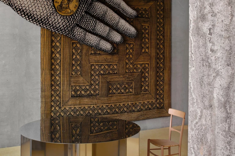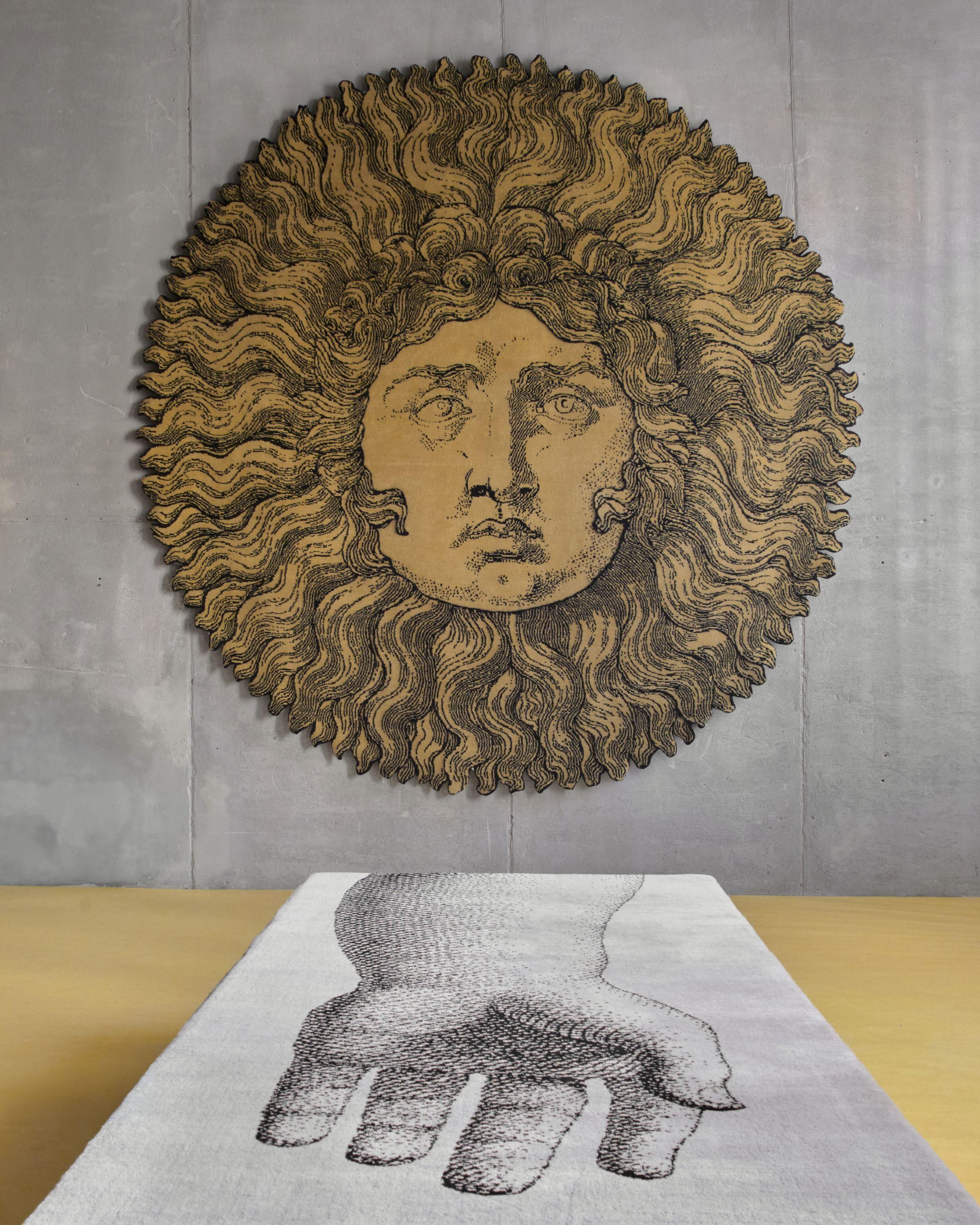 Cc-tapis połączyło siły z domem Fornasetti, przenosząc ikoniczne, oniryczne motywy z mediolańskiego archiwum w świat współczesnego rzemiosła. Kolekcja (META)FISICA - której nazwa nawiązuje do słynnego parawanu „La Stanza Metafisica” zaprojektowanego przez Piero Fornasettiego w 1958 roku - stanowi wizualny dialog między surrealistyczną wyobraźnią a techniczną maestrią warsztatów w Nepalu i Indiach.