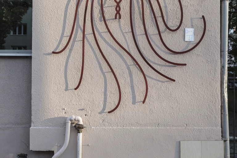 Pierwsza z nich jest „Meduza” zaprojektowana przez Adelę Madej. Jest to ilustracja wycięta z blachy i zamontowana na dystansie na fasadzie bloku przy ulicy Traugutta. Dzięki tej formie montażu wydaje się lekka - „pływa” przy ścianie.