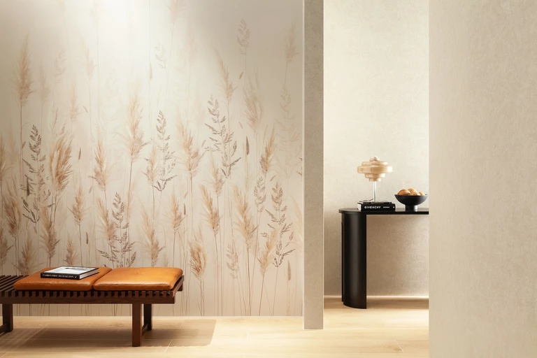 Mantigo to kolekcja dla tych, którzy wiedzą, że prawdziwe piękno kryje się w tym, co nieoczywiste – w fakturze, którą czuć pod palcami, w świetle, które powoli odkrywa kolejne warstwy materiału. To zaproszenie, by zatrzymać się na moment i docenić rzemieślniczą sztukę, w której każdy detal ma znaczenie. Kolor Ivory w połączeniu z pełnym głębi, inspirowanym kwarcytem wzorem Patagonia Naturale tworzy duet o charakterze nowoczesnej elegancji – świetlisty, ale jednocześnie intrygujący. Z kolei odcień Beige, zestawiony z naturalnym drewnem i dekorem Natural Grass, buduje atmosferę organicznego ciepła. W obu wariantach Mantigo staje się językiem subtelnego wyrafinowania, który pozwala projektantom wnętrz grać detalem jak nutą w kompozycji.