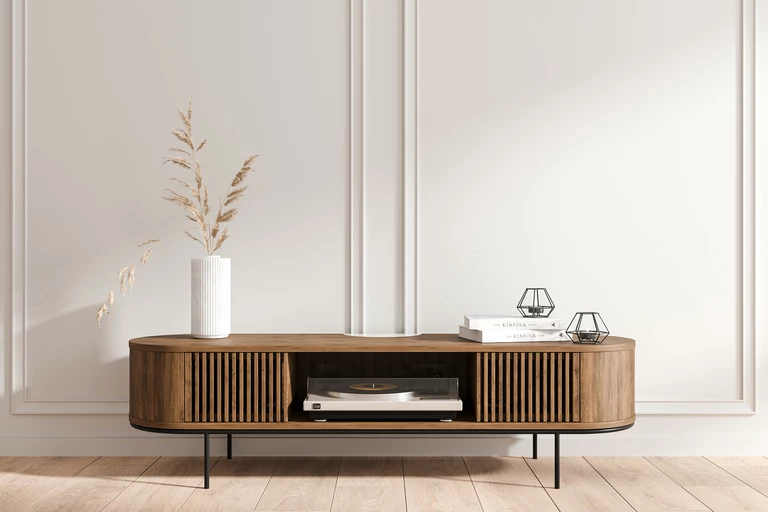 Esencja fornirowanego wykończenia obłych kształtów z kamiennym detalem.