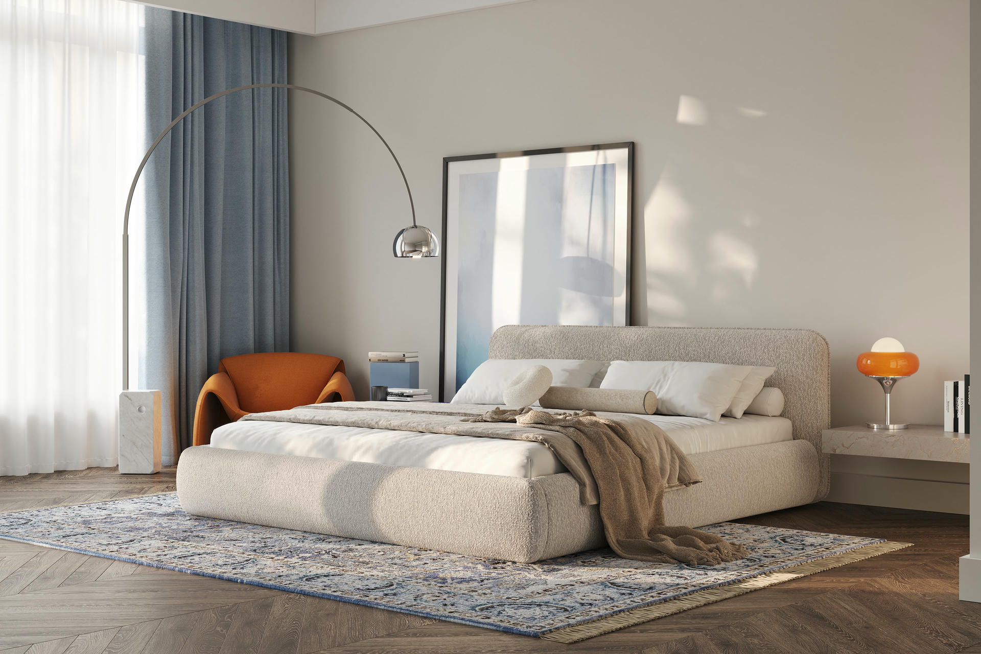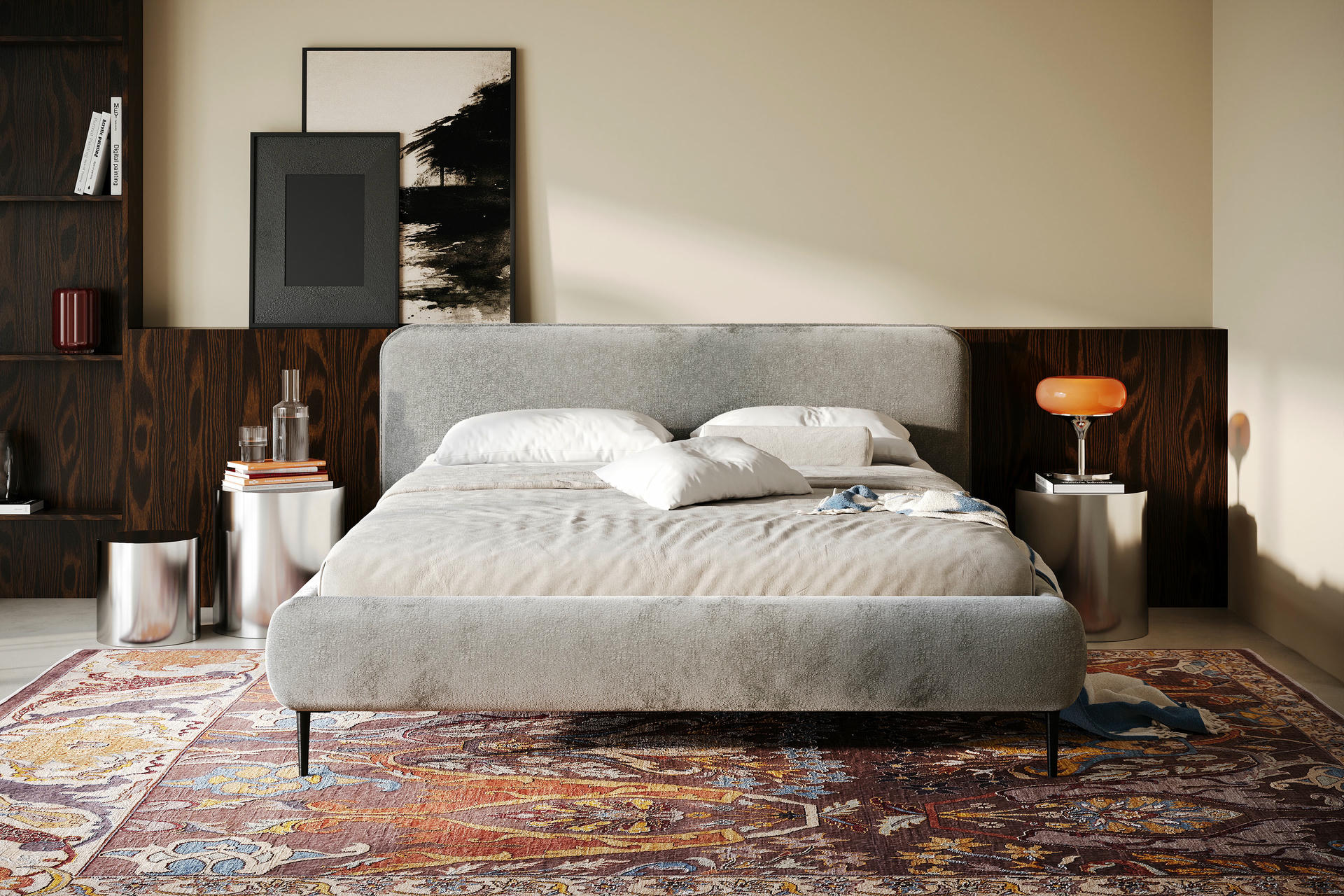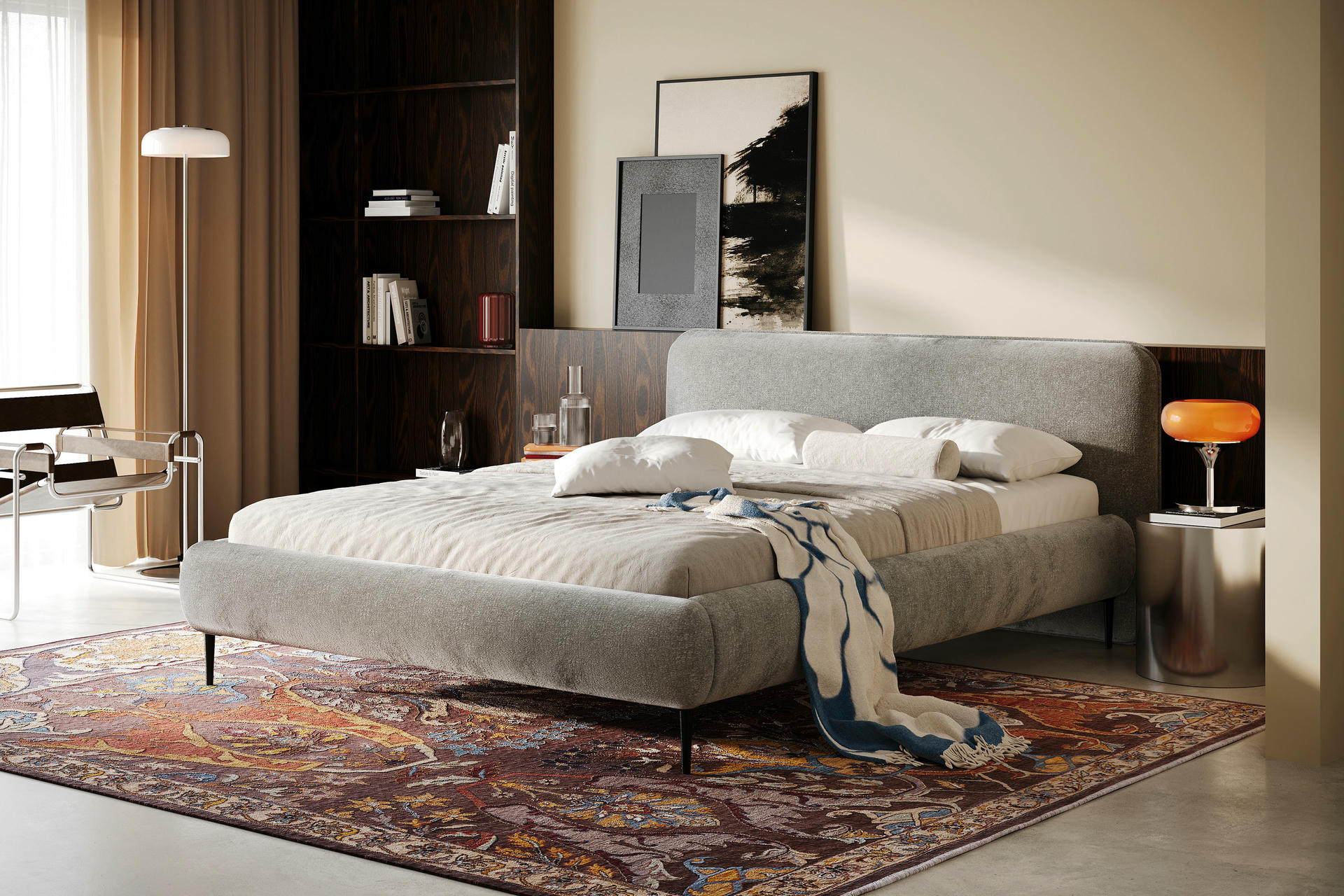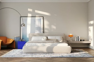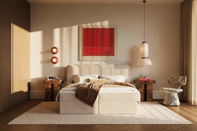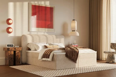Miękko wyprofilowane wezgłowie daje efekt przytulnego oparcia i buduje spokojny, domowy klimat. To wariant, który świetnie odnajduje się w sypialniach, gdzie liczy się ciepło materiałów i kojąca forma.