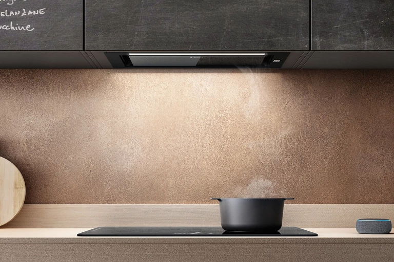 W małych kuchniach powstają wielkie rzeczy, dlatego w kameralnym wnętrzu idealnie sprawdzi się okap podszafkowy Hidden 2.0@, całkowicie ukryty w szafce wiszącej, który rozświetla strefę gotowania przyjemnym światłem.