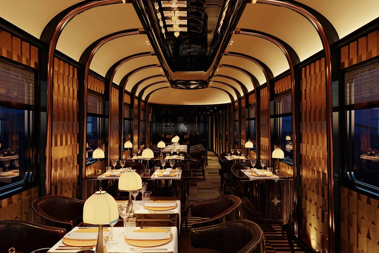 Spektakularny i nieoczekiwany wagon restauracyjny powraca do stylu klasycznego Orient Expressu. Maxime d'Angeac reinterpretuje motyw „szyny” stworzony przez Suzanne Lalique-Haviland w 1930 roku, który został przerobiony na ściankach przy użyciu techniki stoneboard. Pod lustrzanym sufitem, poprzecinanym szeregiem łuków, w pełnej harmonii układają się stoły i fotele oświetlone abażurami nawiązującymi do oryginalnych modeli.