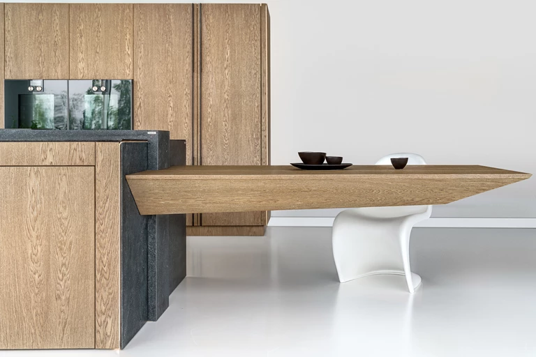 W najmodniejszych kuchniach fornir układany jest tak, by słoje biegły pionowo. To potęguje wrażenie lekkości. Naturalny charakter materiału podkreślić może głęboko wyszczotkowana powierzchnia. Taka wyraźnie wyczuwalna pod palcami matowa tekstura zastosowana jest w modelu Phantom marki Zajc, autorstwa Patryka Zajc. Najbardziej charakterystycznym i bardzo modnym elementem tej kuchni jest zintegrowany z wyspą stół. Tutaj ich połączenie rozwiązano w innowacyjny sposób. Konstrukcja wyspy oparta jest na przeciwwadze. Dzięki temu stół nie ma nóg, ale zachowuje swoją stabilność i wygodnie mogą przy nim usiąść nawet cztery osoby. Obok dębu w naturalnym odcieniu popularność zdobywa dąb wędzony. Spektakularny efekt osiągnięty jest tu przez subtelną grę odcieniami drewna. W ten sposób wykończone zostały fronty wyspy modelu Z4 marki ZAJC.