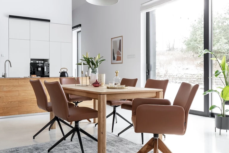 Natomiast stół Livia to połączenie nietuzinkowej metalowej konstrukcji z dębowym blatem, którego krawędzie są wykończone w „szwajcarski kant”, co nadało całości elegancję i lekkość. Uzupełniając stół Livia o zestaw krzeseł Perla, stworzymy piękną, jadalnianą przestrzeń, która będzie cieszyła swoim wyglądem i funkcjonalnością.