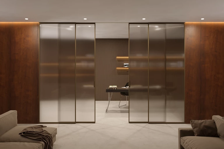 Wysokość 300cm, szerokość pierwszego skrzydła do 140cm w systemach 1-, 2-, 3- szynowych. Automatyczny domyk, brak toru dolnego, lekkość systemów jezdnych. Szkło grafitowe, brązowe, satynowe, ornamentowe i inne. Nowością są piękne wzory heksagonalne.