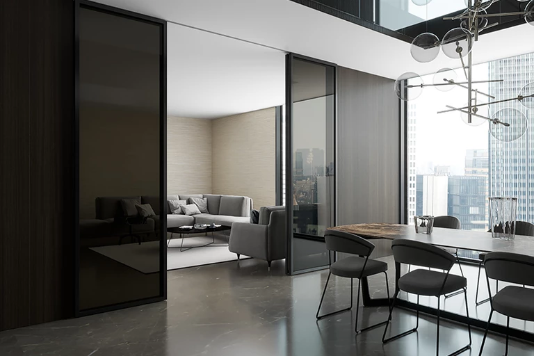 Nowoczesne drzwi szklane z ościeżnicą ukrytą oraz zawiasem listwowym do wysokości 250 cm. System składa się z ościeżnicy aluminiowej, zawiasów ukrytych wraz z uszczelkami oraz zintegrowanej klamki z zamkiem. Drzwi PIU Glass Line można wykonać w ramce okalającej skrzydło ze szprosami w kolorach czarnej szczotki (brushed black) lub brązu szczotkowanego (brushed dark brown) – drzwi loftowe. To detal, który ma znaczenie. Nowością jest ponadstandardowa wysokość tafli szkła do 250 cm. Różne odcienie szkła tj. grafit, czarny, opti white, satyna. Zaletą drzwi szklanych jest elegancki wygląd, który dodaje szyku nowoczesnym wnętrzom. PIU Glass doświetlają i powiększają optycznie przestrzeń garderoby, łazienki czy gabinetu.