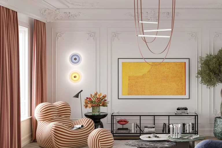 Autorka wyróżnionej pracy pokusiła się o wprowadzenie (z dużym sukcesem) telewizora Samsung The Frame do wnętrza, gdzie dominują obłości, wyraziste faktury, naturalne materiały. Przedstawiony salon jest równocześnie elegancki jak i niewymuszony. Takie przestrzenie zazwyczaj w swojej estetyce nie tolerują jakiejkolwiek widocznej elektroniki. Tu udało się to z powodzeniem.
