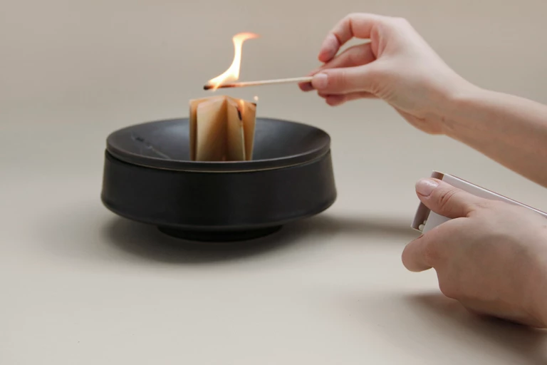 Świeca przyjmuje tu postać arkusza papieru pokrytego woskiem pszczelim, który spala się w dedykowanej czarce z ceramiki.