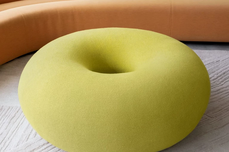 Nie mniej istotny od formy mebla jest jego kolor. Z zamiłowania projektantki do żywych barw powstały dwie opcje kolorystyczne tapicerki – „Sulphur Yellow” (widoczna na zdjęciach) oraz różowa, czyli „Cotton Candy”. Nie zapomniano jednak o fanach naturalnej kolorystyki. Specjalnie dla nich przygotowano puf „Oatmeal” w odcieniu beżu.