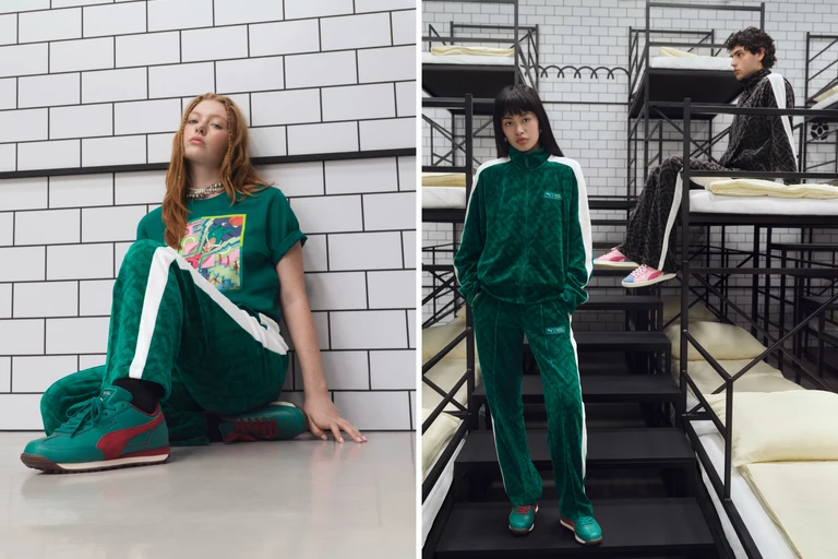 T7 Track Jacket i T7 Track Pants, czyli znaki rozpoznawcze sportowej marki, zyskały nową odsłonę dzięki unikalnemu wzorowi inspirowanemu schodami z serialu, w którym ukryto logotypy PUMA. Tealowo-zielona kolorystyka, nawiązująca do uniformów uczestników tajemniczej i śmiertelnej gry, została podkreślona aksamitną fakturą materiału, niestandardowymi metkami oraz współdzielonymi logotypami na piersi.