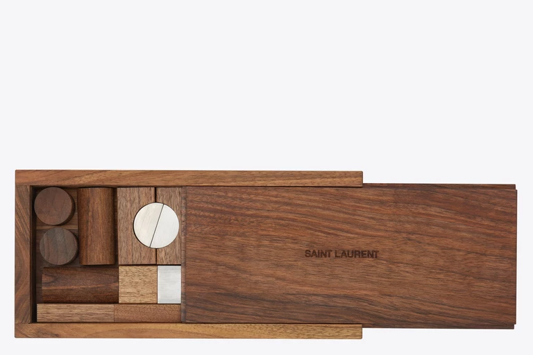 Projektant Anthony Vaccarello zaprojektował unikatowe pudełko wypełnione drewnianymi i metalowymi klockami, przypominające puzzle. Produkowany w niewielkich ilościach i dostępny wyłącznie w sklepach Saint Laurent Rive Droite w Paryżu i Los Angeles zestaw to ozdoba, która z pewnością stanie się cenną pozycją kolekcjonerską.