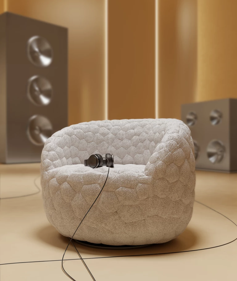 Introvert Chair powstał jako „cicha kontrpropozycja” wobec przebodźcowania. Szerokie, otulające oparcie i bogato wyściełana konstrukcja (z mechanizmem obrotowym) pozwalają „zawinąć się” w fotel jak w koc. Opcjonalne Comfort Cushions i Security Blanket dopełniają wrażenia domowego kokonu.