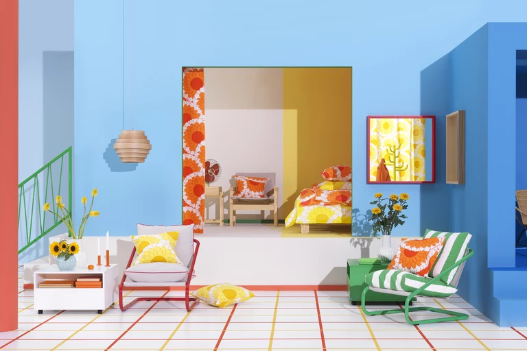 Tkanina SANDETERNELL z tym samym kwiatowym wzorem zachęca do kreatywnych projektów – uszyj z niej poszewki, torbę lub rozłóż na sofie, by wnętrze domu eksplodowało kolorami.