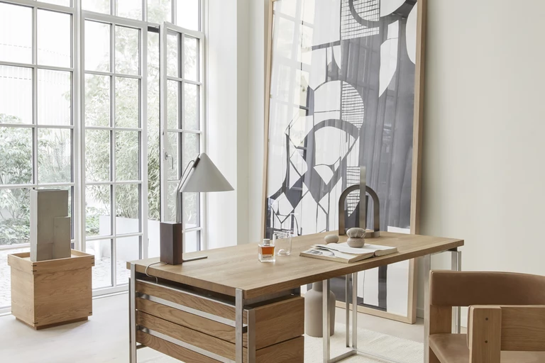 Wystawę zatytułowano „The Frame Sculpture”. Było to naprawdę wspaniałe podsumowanie 10 lat działalności marki. Z nowości najbardziej przypadło nam do gustu biurko Outline. Jego smukłe linie tworzą graficzną grę stalowych ram, które utrzymują blat i szuflady z litego dębu.