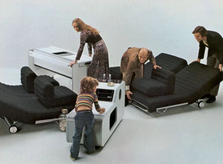 Od lat 50. tematy science fiction zaczęły stawać się rzeczywistością: pojawiły się pierwsze satelity, rozpoczęła się eksploracja przestrzeni kosmicznej, a USA i ZSRR podjęły wyścig o lądowanie na Księżycu. Te wydarzenia odcisnęły swoje piętno również na designie – Gae Aulenti, Eero Aarnio, Luigi Colani, Joe Colombo czy Verner Panton projektowali meble o organicznych formach i błyszczących powierzchniach z tworzyw sztucznych.