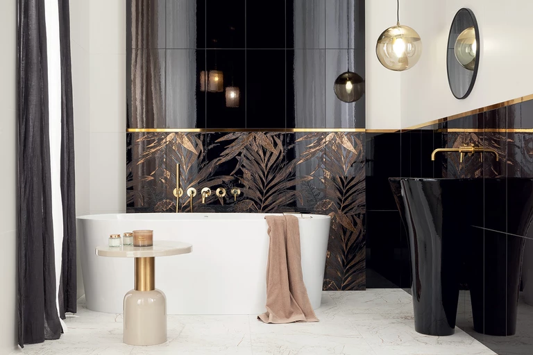 Czerń pomoże stworzyć eleganckie wnętrze, pełne wytworności i dostojności. Zarówno płytki o gładkiej powierzchni, jak i te udekorowane deseniem roślin, swobodnie wpisują się w styl glamour, modern classic oraz vintage.