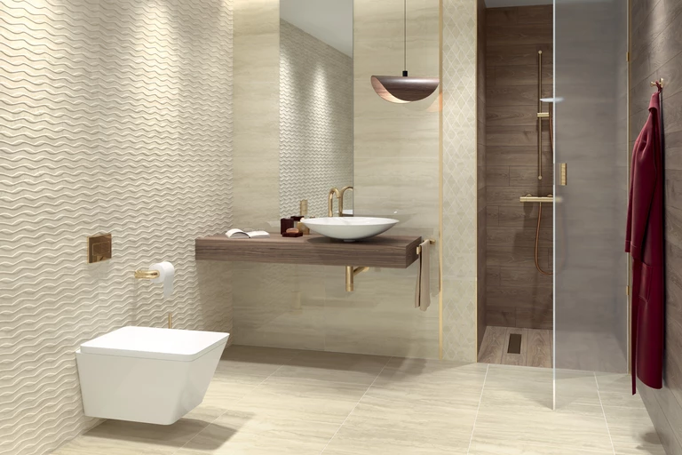 Płytki bazowe i inserta w formacie 29,8 x 59,8 cm to wyrafinowane połączenie złota i marmuru calacatty w ciepłej tonacji jasnego beżu i bieli, stanowiące doskonałe tło dla spektaklu światła rozlewającego się rano po domu. Łagodna i delikatna kolorystyka zaczerpnięta z barw towarzyszącym chwilom, kiedy noc miesza się z dniem może być świetną bazą do aranżacji pomieszczeń w różnych stylach. W kolekcji znajdziemy także gres w formacie 29,8 x 59,8 cm, który z powodzeniem zastosować na podłodze.
