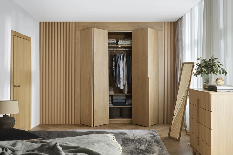 3. Przemyślane rozwiązania: Przesuwno-składane drzwi oszczędzają przestrzeń i zapewniają swobodny dostęp do całego wnętrza szafy. Subtelne podświetlenie LED z czujnikiem ruchu ułatwia odnalezienie potrzebnych rzeczy, nawet w głębokich szafach. Z kolei system cichego domykania zapewnia komfort użytkowania.