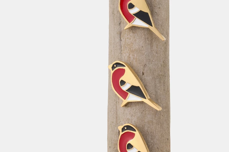 Te pozłacane, emaliowane piny inspirowane są przyrodą polskich miast, wsi i lasów. Marcelina projektuje je samodzielnie – od szkiców do formy. Odlewy wykonywane są w małej, rodzinnej, polskiej firmie. Wnętrze przypinki to stop cynku z aluminium, zaś zewnętrzna część składa się z powłoki galwanicznej z twardego złota oraz ręcznie malowanej i wypalanej emalii.