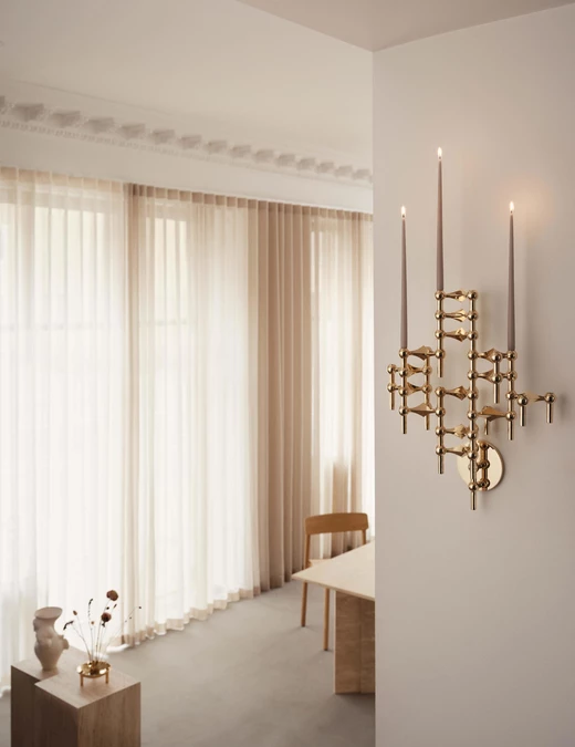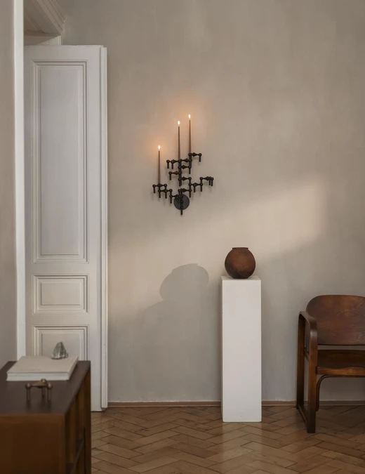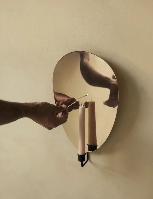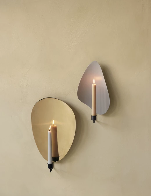 Świecznik ścienny „Flambeau” od duńskiej marki Audop Copenhagen inspirowany był francuskim modernistycznym oświetleniem. Jego kształt przypominać ma migający płomień ognia. Metalowa osłonka nie tylko chroni ścianę, ale także odbija światło, co potęguje nastrój. Za projekt świecznika odpowiada duńskie studio Krøyer-Sætter-Lassen.