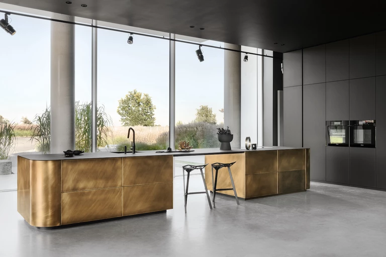 Kuchnia MET inspirowana jest estetyką lat 50. dwudziestego wieku, z jej charakterystycznymi zaokrąglonymi krawędziami mebli. Odnajdziemy je w formie wyspy kuchennej. Uwagę przykuwa tu nie tylko kształt mebla, lecz również szlachetny blask frontów z mosiądzu, które wykonane są ręcznie i zostały zabezpieczone specjalną technologią przed zmianą wyglądu. Doskonale opanowane rzemiosło umożliwiło idealne dopasowanie blatu do metalowych frontów, a także wykonanie zagiętych pod kątem uchwytów.