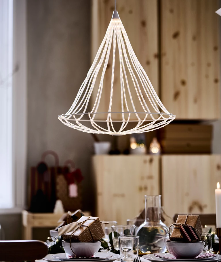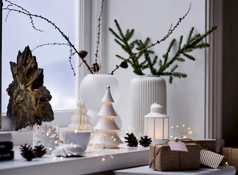 Dla tych, których pociąga spokój, motyw „Białych Świąt” oferuje oddech wyciszenia. Unikając potrzeby rzeczywistego śniegu, koncepcja ta opiera się na subtelnych fakturach i delikatnym blasku oświetlenia STRÅLA, aby stworzyć spokojne, zimowe schronienie. Kluczowe elementy, takie jak VINTERFINT świecznik o czystych liniach czy delikatna poświata z kloszy STRÅLA, współgrają z białymi dekoracjami i szklanymi akcentami, tworząc atmosferę wyrafinowanej prostoty. To poszukiwanie równowagi, gdzie światło rzeźbi cichą elegancję przestrzeni.