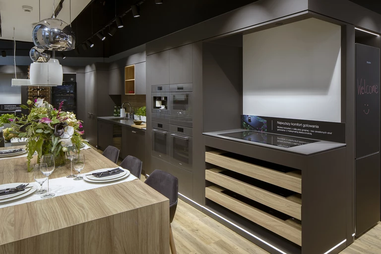 Wnętrze o powierzchni ponad 170 m² jest spójne z międzynarodowym projektem, zgodnie z którym salony Miele powstają na całym świecie. Dominuje grafitowa zabudowa z akcentami w kolorze jasnego dębu.  Aktywna kuchnia przeznaczona na pokazy i warsztaty kulinarne jest zintegrowana z częścią wystawienniczą. Goście salonu znajdą tu także strefę pralnictwa i ekspozycję odkurzaczy, a w strefie kawy napiją się ulubionego napoju. Interaktywny system wizualizacji pozwala wybrać lub skonfigurować urządzenia do zabudowy – także te, których nie ma na ekspozycji, a w asyście doradców można na miejscu testować urządzenia z każdej kategorii.
