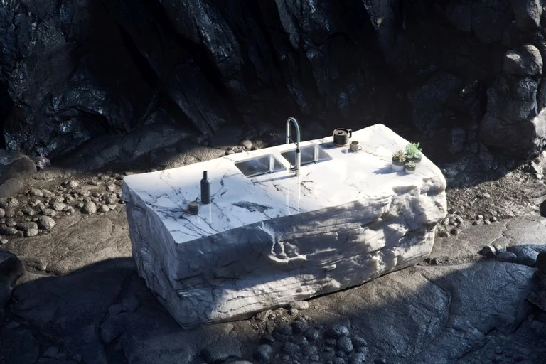 Zlew jaskiniowy – proces ten przebiegał dwutorowo, bo surrealistyczne obrazy elementów kuchennych w otoczeniu natury zestawiono z klasycznymi prezentacjami stylowych wnętrz. To, co je łączy to nie tylko jeden z czterech konkretnych modeli zlewozmywaka, ale i paleta kolorystyczna, będąca ich wspólnym mianownikiem. Od początku wiadomo było, że punktem wyjścia stanie się natura, a zaczęło się od jaskini. Pojawiła się jako tło dla surowego stalowego zlewu, dzięki odmiennej fakturze nieregularnej, poszarpanej krawędzi kamienia i kontraście barwowym oscylującym wokół bieli, szarości i czerni.