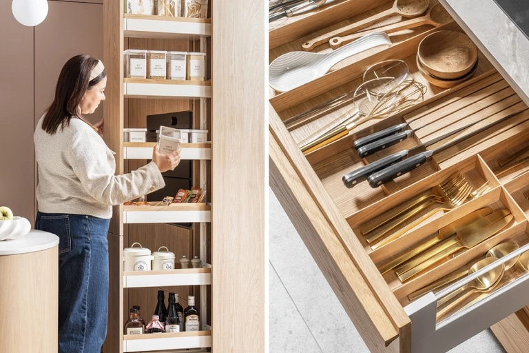 Co zrobić z wąskimi przestrzeniami między szafkami czy piekarnikiem? „Nie ma miejsca, którego nie da się dobrze wykorzystać” – zauważa ekspertka. Cargo PINELLO to świetne rozwiązanie do przechowywania butelek, olejów czy przypraw. Dzięki wysuwanym mechanizmom wszystko jest pod ręką i nie ginie w gąszczu szuflad.